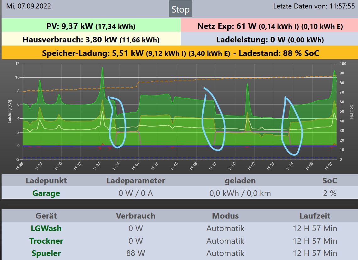 Ergänzend zu meinen bisherigen Screenshots hier nochmal ein weiterer aus der Phase der Batterieladung. Ich vermute, dass die Zuordnung der Hausverbrauchswerte, insbesondere der Geräte die über das SmartHome 2.0 erfasst sind einen deutlich stärkeren Einfluss auf die erhöhten Monetanwerte während der Ladephase haben als angenommen.