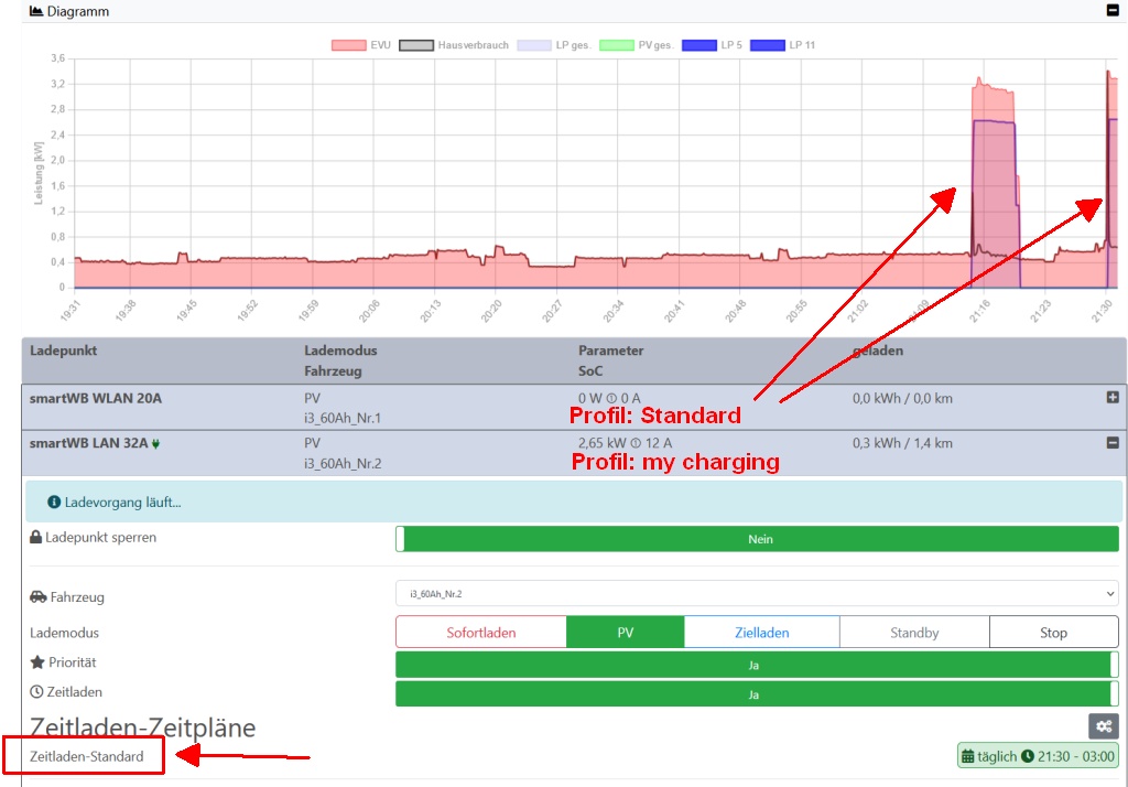 Lustig ist nun aber, dass Profil "Standard" mit Auto Nr.1 verknüpft ist, aber an Auto Nr.2 mit Profil "my charging" (deaktivierter Zeitplan) real geladen wird, also genau umgedreht.