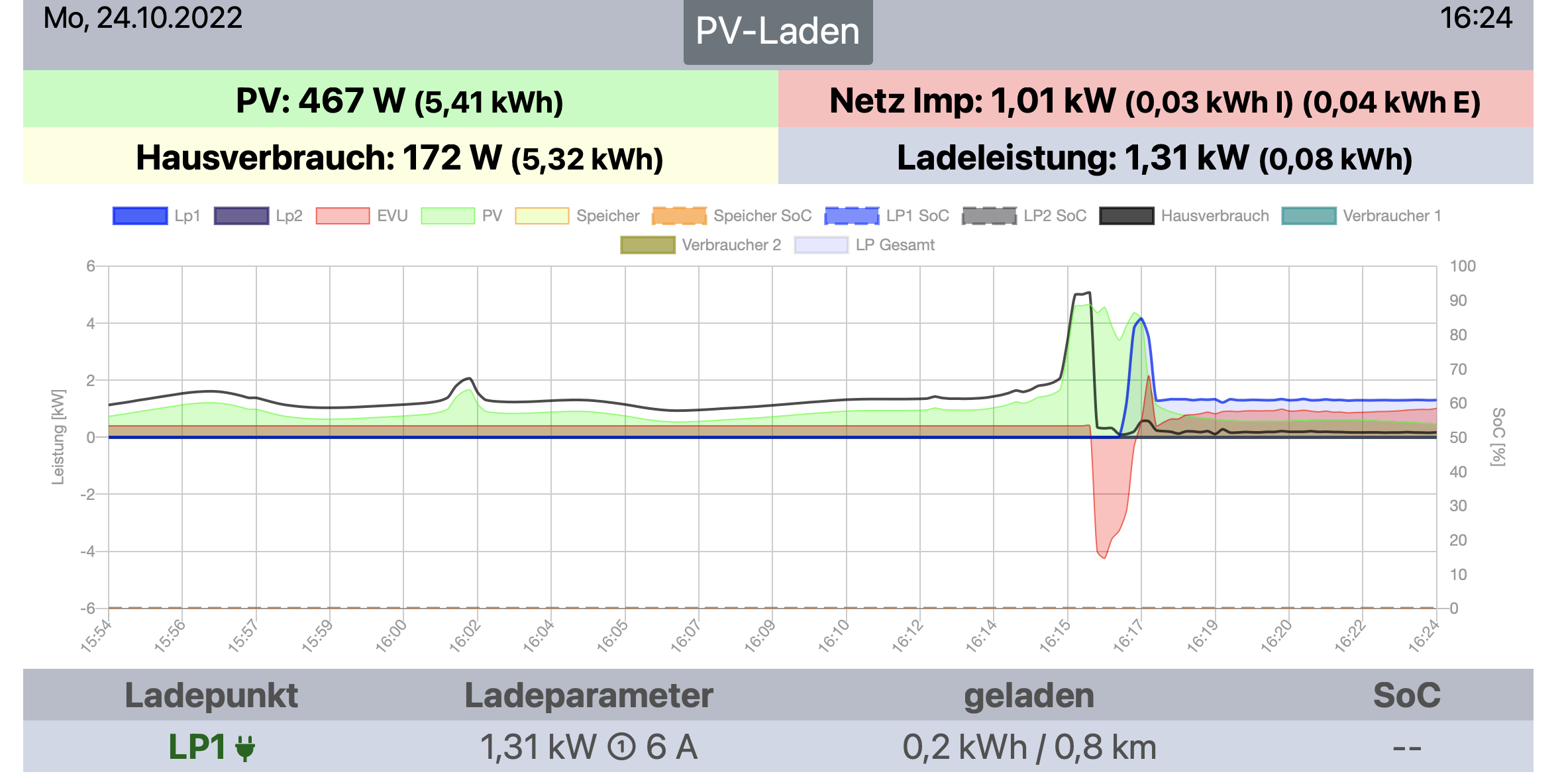 Jetzt werde ich noch an den PV-Einstellungen rumfentern müssen, glaube ich. Aber sie lädt und zeigt korrekt an und damit bin ich wieder einen Schritt weiter.