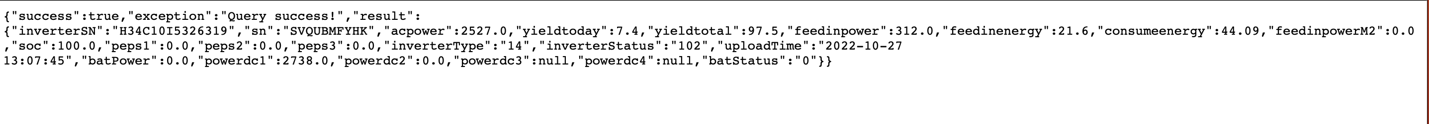 {"success":true,"exception":"Query success!","result":{"inverterSN":"H34C10I5326319","sn":"SVQUBMFYHK","acpower":1074.0,"yieldtoday":10.4,"yieldtotal":100.5,"feedinpower":802.0,"feedinenergy":23.02,"consumeenergy":44.09,"feedinpowerM2":0.0,"soc":100.0,"peps1":0.0,"peps2":0.0,"peps3":0.0,"inverterType":"14","inverterStatus":"102","uploadTime":"2022-10-27 15:27:47","batPower":0.0,"powerdc1":1188.0,"powerdc2":0.0,"powerdc3":null,"powerdc4":null,"batStatus":"0"}}-