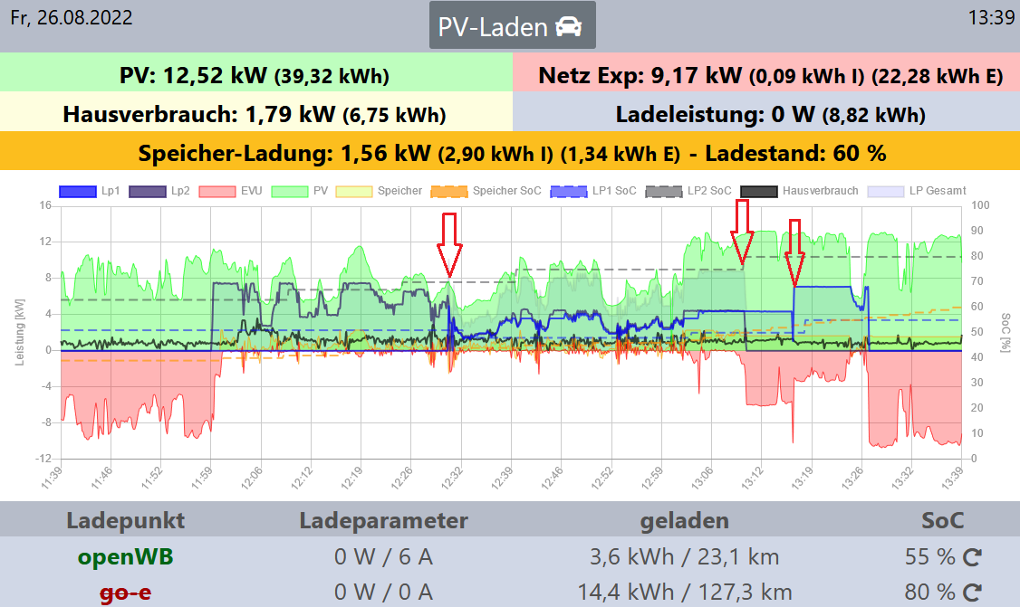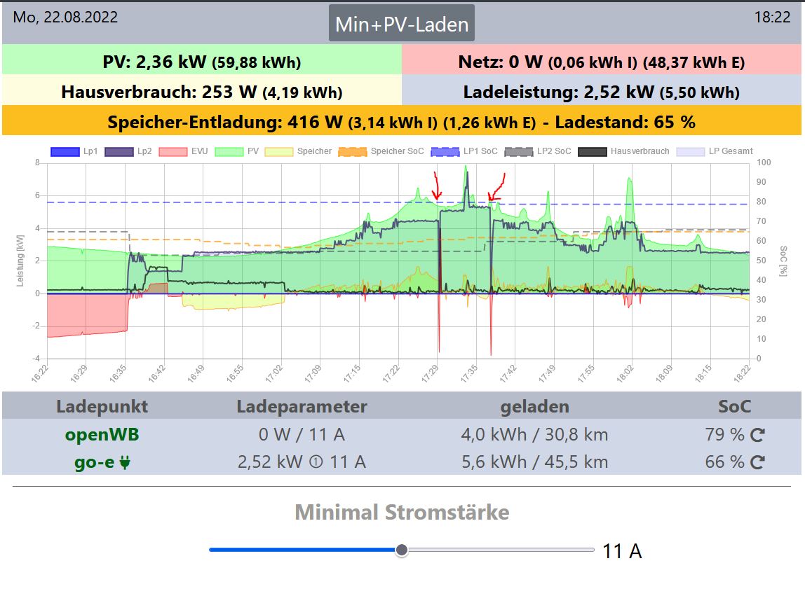 Beim einstecken des 2. Autos (1. roter Pfeil) wird erkannt, dass der Überschuss für 2 Autos zu gering ist, und es werden beide LP auf 1p umgeschaltet.