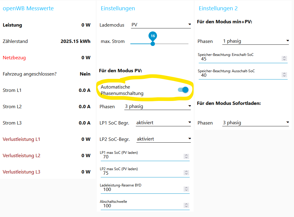 Falls man wieder den orig. openWB Automodus benutzen möchte, deaktiviert man den Schalter und wählt unterhalb bei "Phasen" Automatik aus.
