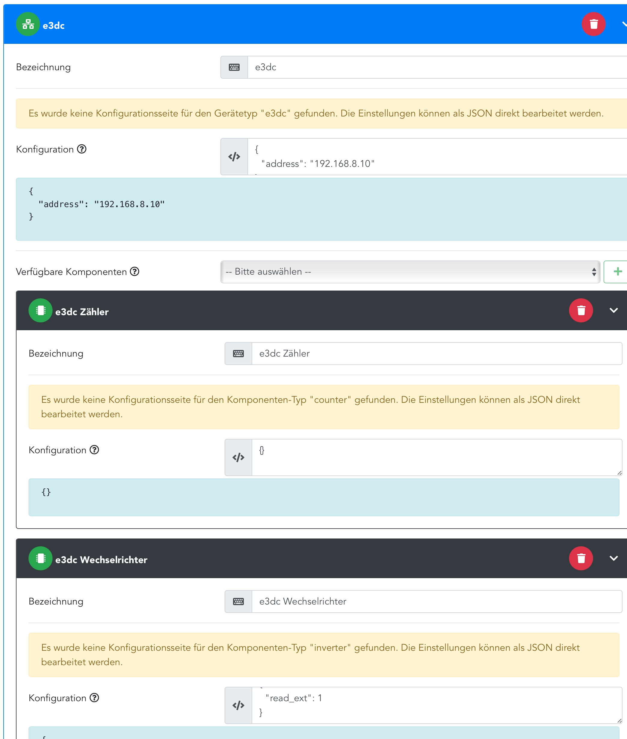Danke! Hab' ich auch gleich mal ausprobiert - es fehlen wohl noch ein paar Konfig-Elemente für die Einstellungen. Wenn ich aber bei address die IP-Adresse eintrage, funktioniert der Zähler sofort. Beim Wechselrichter muss die id auf 1 gesetzt werden. Nur beim Speicher komme ich nicht weiter.