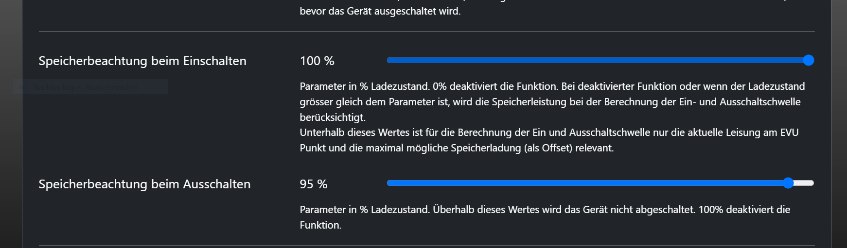 Ich habe dazu "Speicherbeachtung beim Einschalten" auf 100% und Speicherbeachtung beim Ausschalten auf 95% gesetzt.