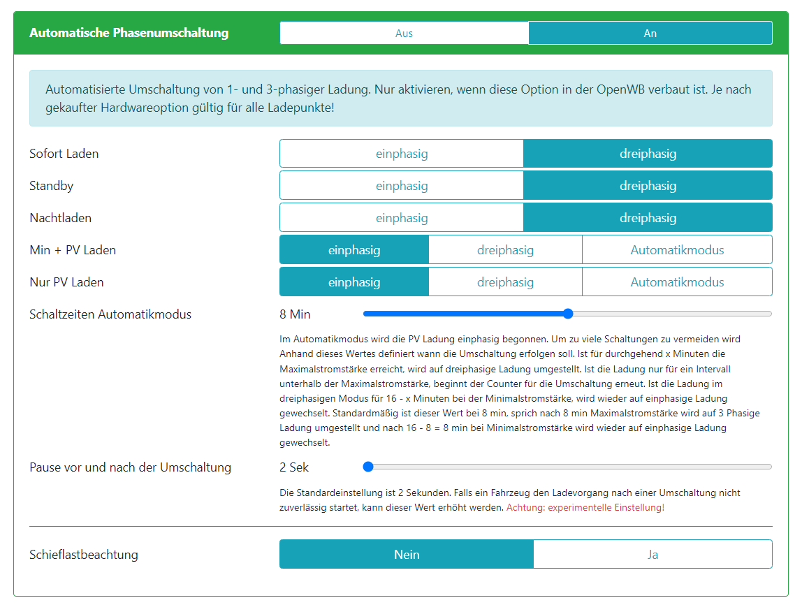Vielleicht gibt es ja irgendwie eine Einstellung die das 3phasige Sofortladen verhindert.