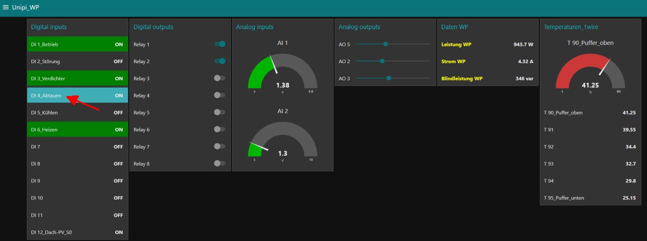 Dank der UniPi-EVOK-API, die 1a in Node-Red einbindbar ist, sind nun fast alle Komponenten ausles- bzw. ansteuerbar. Aktuell fehlen noch ein paar Temp.-sensoren (1-wire) am PWT und AG (für die AT), um den wasserseitigen Kreislauf regeln zu können.