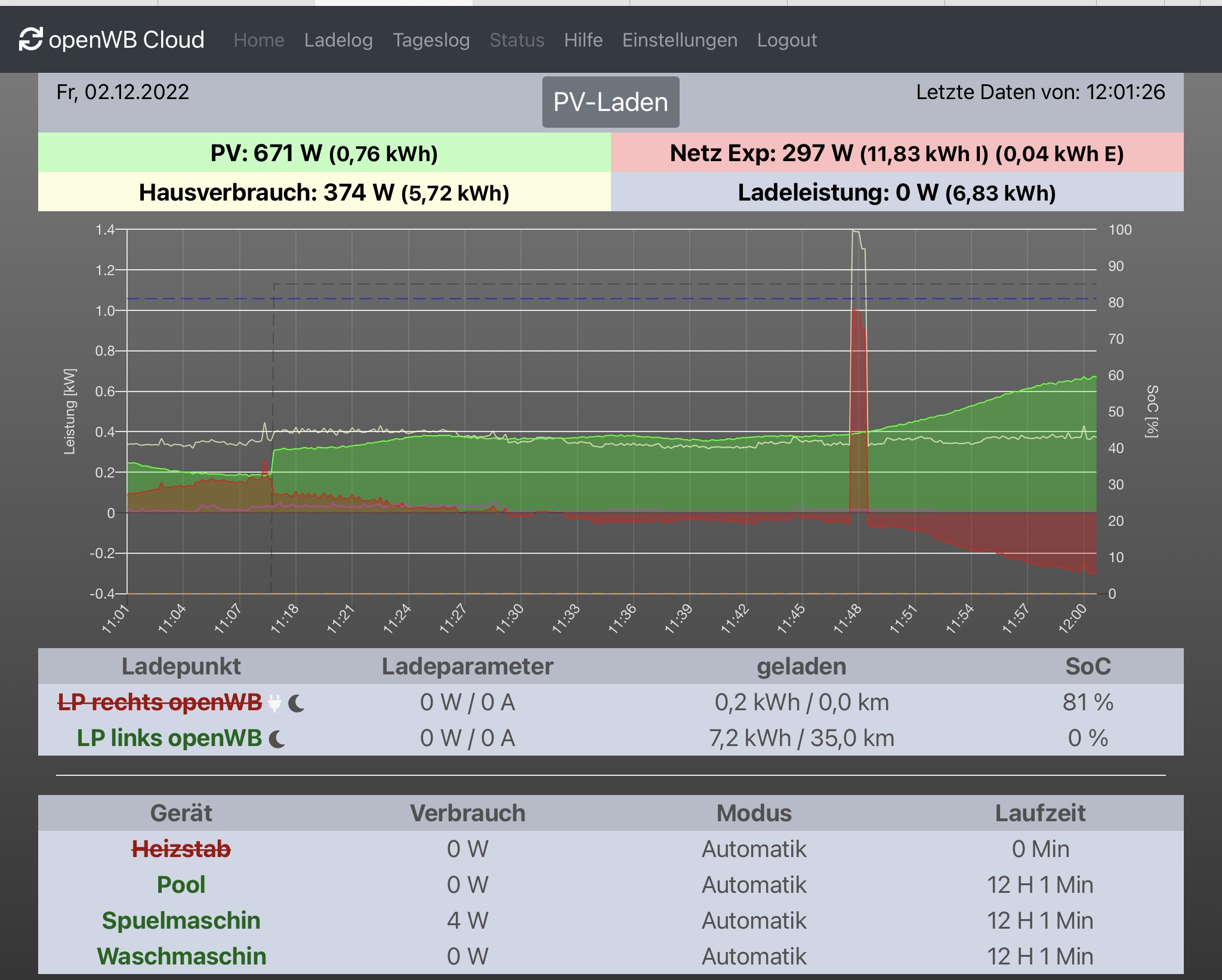 Ich habe neue Zugangsdaten bekommen. Damit stimmt die Zeit und das Diagramm. Der Rest (Smarthome und LP) noch nicht so ganz. Aber es scheint mal eine Verbindung da zu sein. Ob es reicht die Ladeleistung zu erhöhen, weiß ich noch nicht.