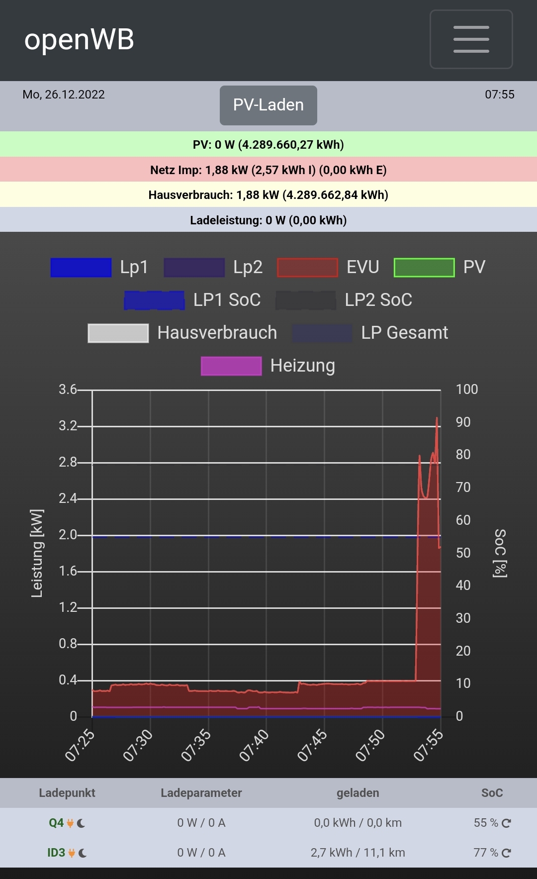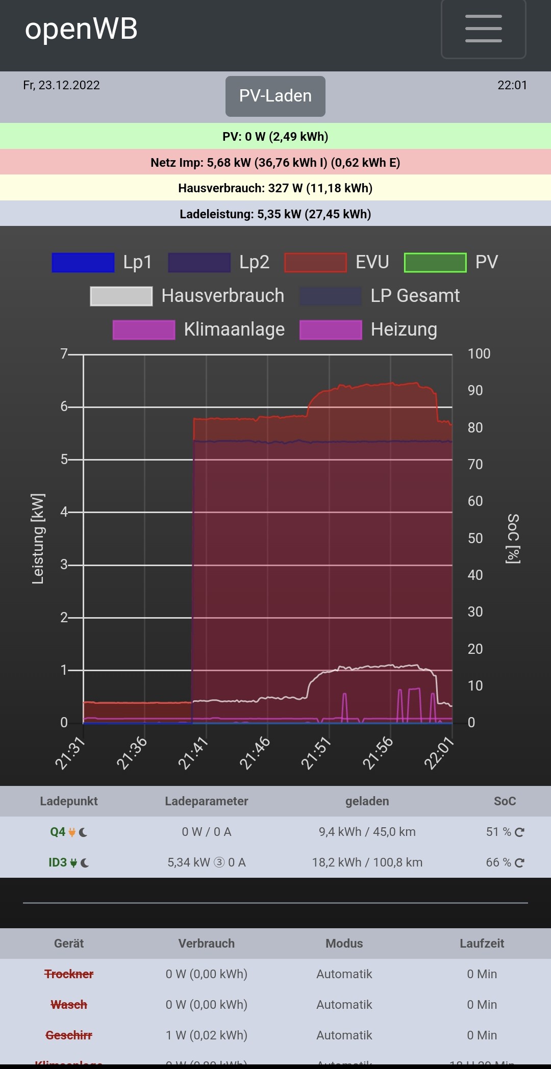 Die 0A (rechts) sind die Sollvorgabe. Links steht die Ist-Ladeleistung.