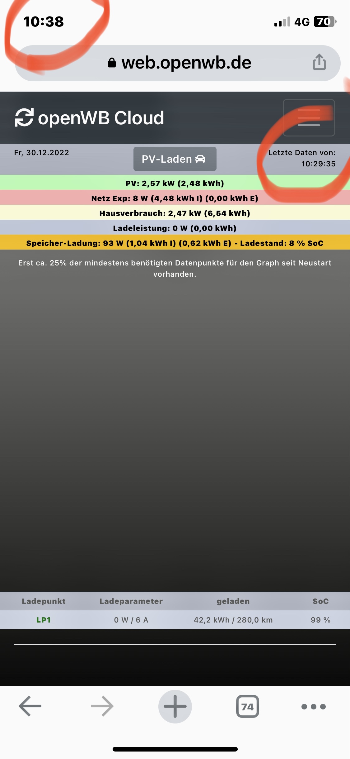In letzter Zeit habe ich aber immer Probleme mit dem Zugriff auf die OpenWB cloud die Daten die bei Abruf kommen sind meist nicht aktuell und stimmen auch manchmal nicht vor allem die Uhrzeit siehe Bild der Graph wir auch nicht geladen, im Ganzen ist der Zugriff auf die Cloud sehr langsam geworden.