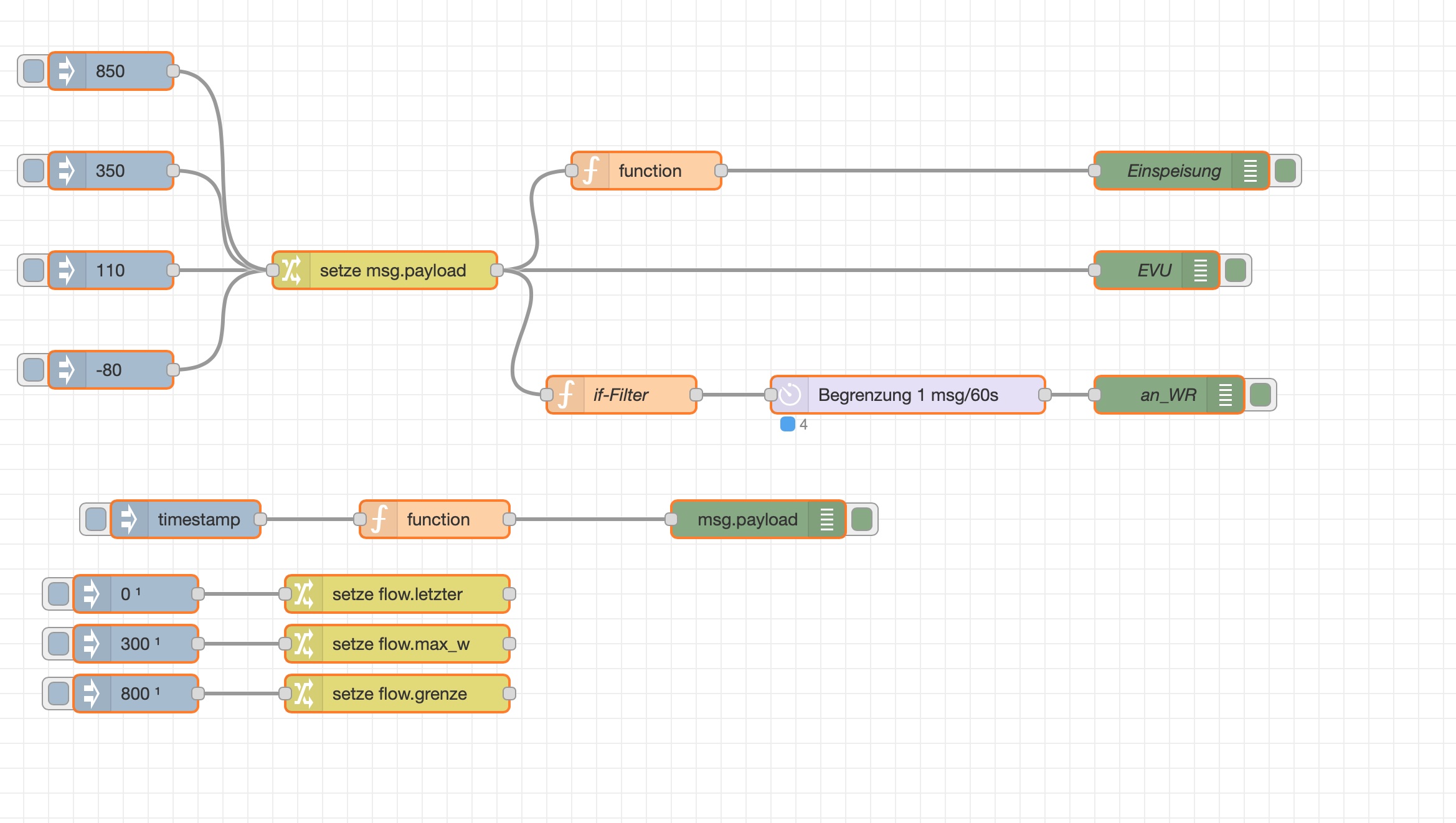 Die drei unteren Inject-Nodes inititialisieren flow-globale Variablen: Einmal die 300, die 800 und die letzte WR-Einspeiseleistung. Darüber für's debuggen die Abfrage dieses Werts und ganz am Anfang Deine Logik, ein wenig angepasst.