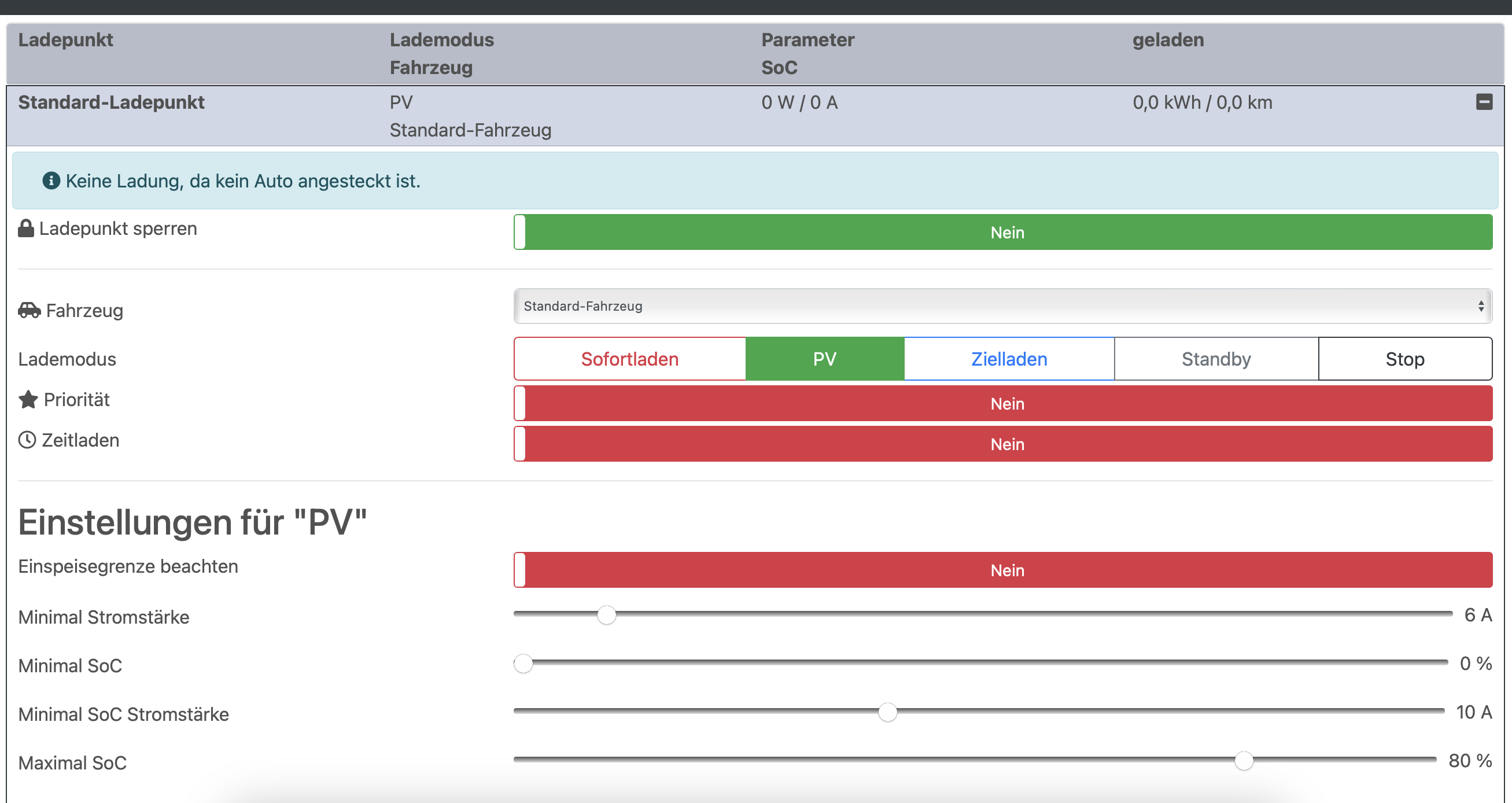 Stivmaster hat geschrieben: So Jan 15, 2023 4:38 pm Mindeststrom steht auf 6 A. Soweit ich das verstanden habe ist, dass wenn du hier 6 A einstellst er diesen Strom auch anlegt, egal ob Überschuß da ist oder nicht. Setze den auf 0 und deine Ladung wird nicht mehr sofort starten. Den Mindeststrom fürs Fahrzeug legst du beim Fahrzeug fest.