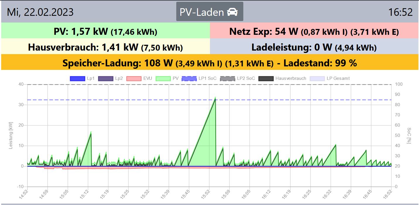 im MQTT Protokoll werden für beide PV Module korrekte Werte als empfangen angezeigt, in der Anzeige gibt es leider sehr unschöne "PV Rampen" die die Grafiken komplett zerschiessen. Es sieht so aus als ob die PV Leistungswerte aufaddiert werden bis irgendwann ein neuer PV Wert per MQTT kommt. Bisher hatte ich nur ein PV1 Modul konfiguriert (da hat alles funktioniert), jetzt ist noch ein PV2 Wechselrichter dazu gekommen, daher vermute ich daß es im zusammenspiel mit dem PV2 MQTT Modul ein Problem geben könnte...