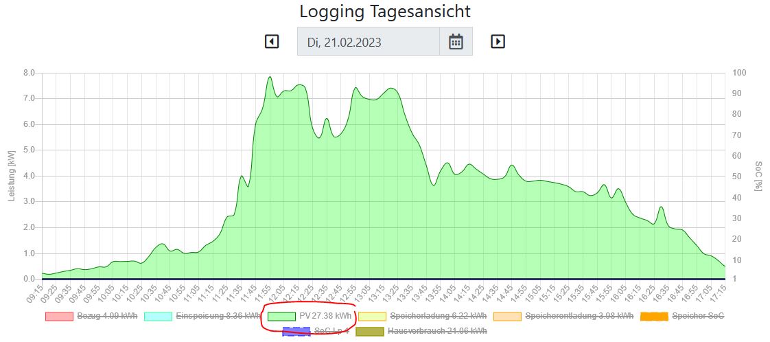 In "Logging Tagesansicht" sowie in den verschiedenen Themen bekomme ich jedoch eine deutlich höhere Produktion angezeigt (ca. 27.5 kWh) mit Spitzenwerten zwischen 7 und 8 kW: