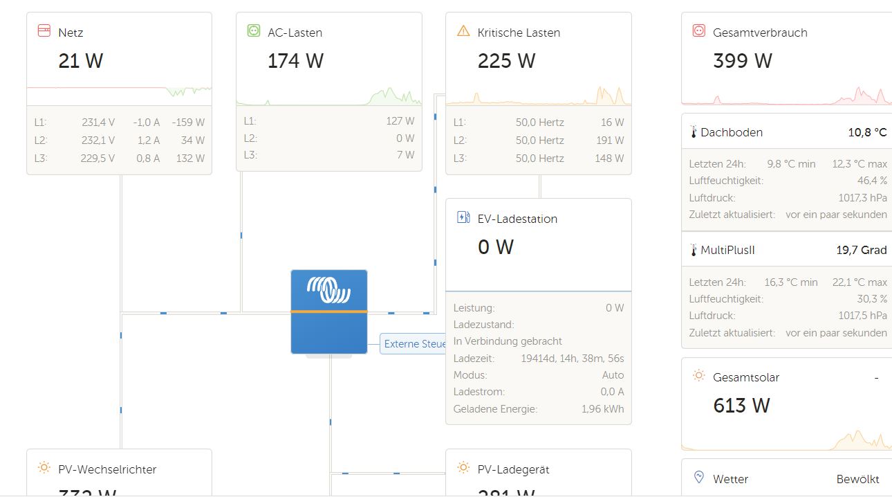 6.76kWp PV mit SMA Tripower 6000TL-20. 2x OpenWB custom 1p3p. EVU/PV über SDM630 via PE11-H. Victron MP2 48/5000 als ESS mit 16s EVE 280Ah Zellen. PHEV Landrover Defender P400e. EV vW eUp