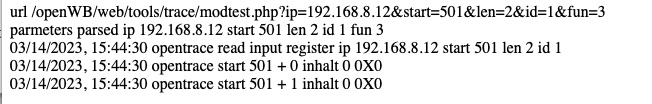 Außerdem habe ich den modtest der openWB bemüht. Dabei habe ich nach dem "opentrace" keine Werte zurückbekommen: