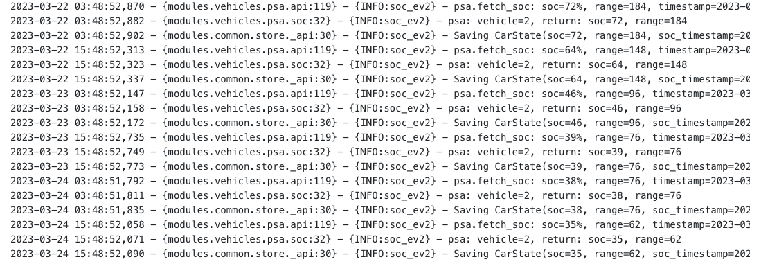 2023-03-24 15:23:51,342 - {modules.common.simcount._simcount:47} - {DEBUG:device0} - imported: 10.2351 Wh, exported: 0 Wh, new state: SimCounterState(timestamp=1679667831.3410087, power=3604.0, imported=98112.4811024013, exported=72793.02585577348)