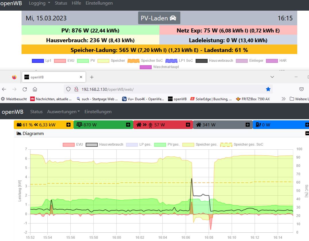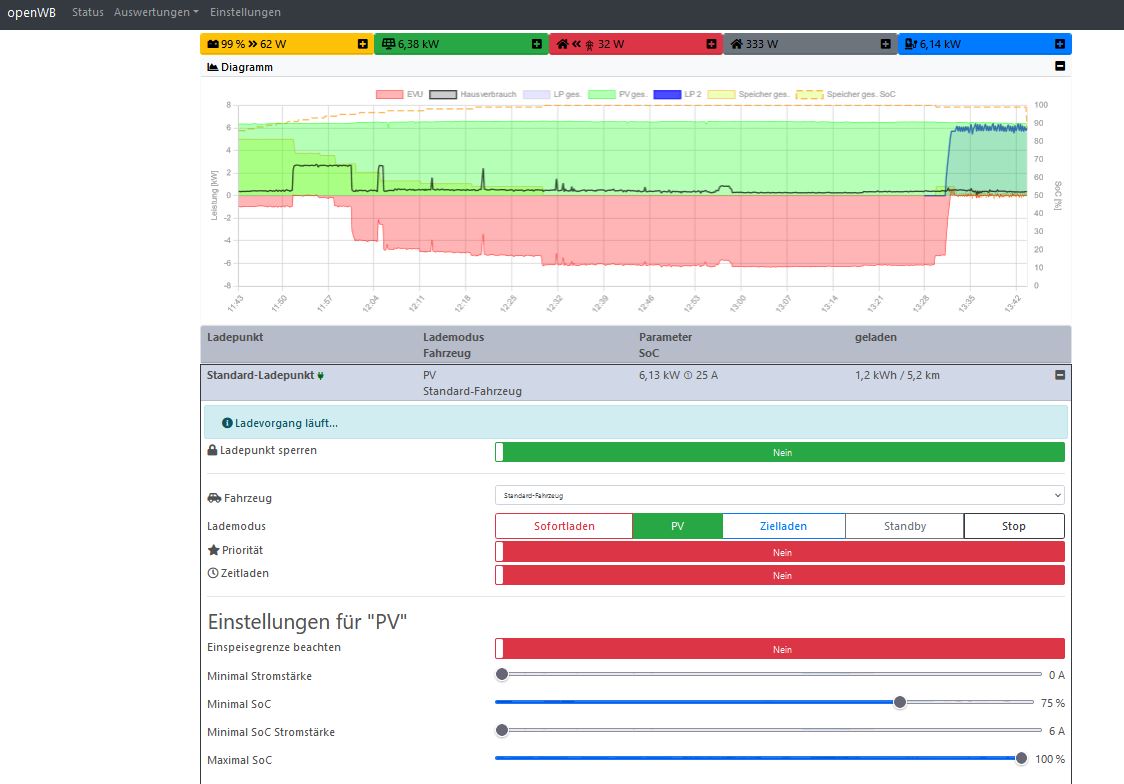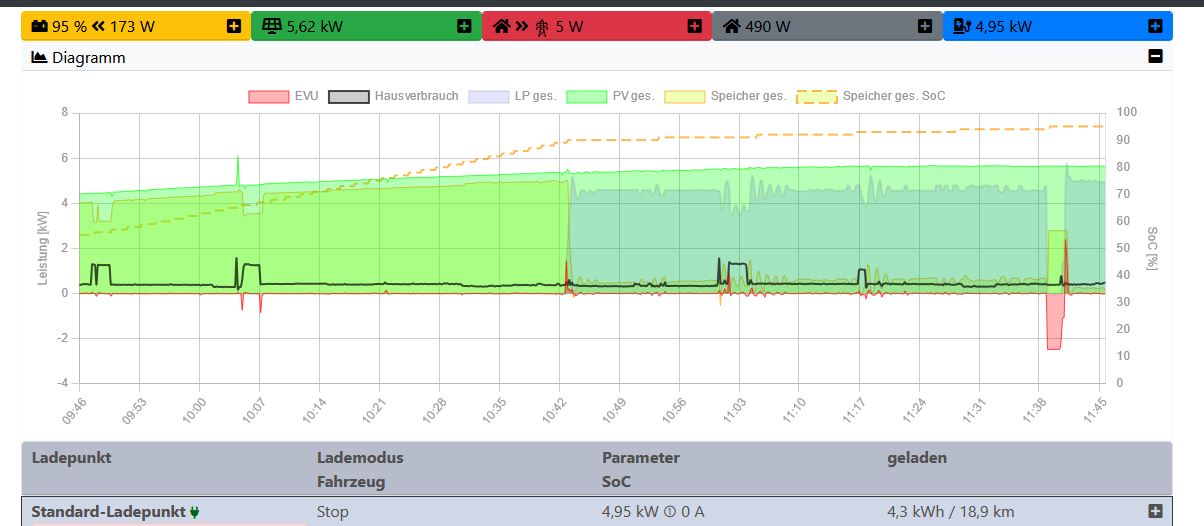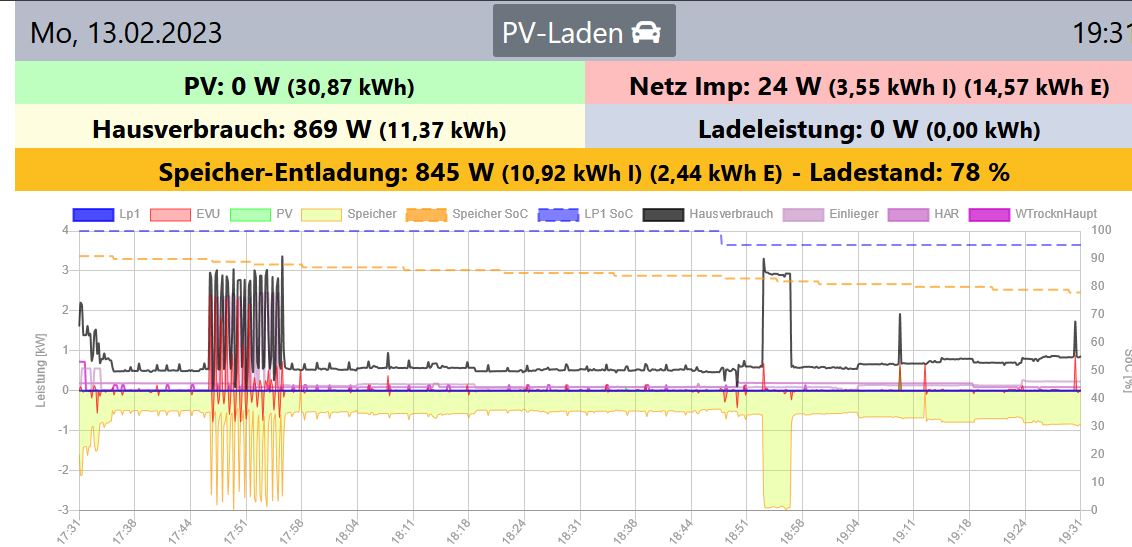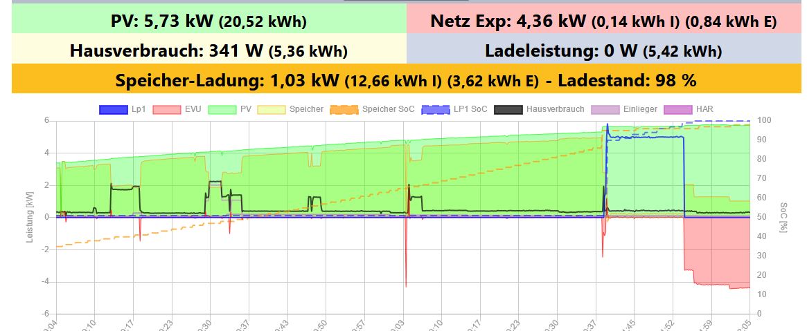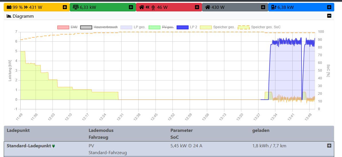 Es hat sich bestätigt, dass bei nahezu konstanter Leistung von PV und Hausverbrauch der Ladestrom laufend pendelt ( im Beispiel zwischen 5,7A und 6,4A ).