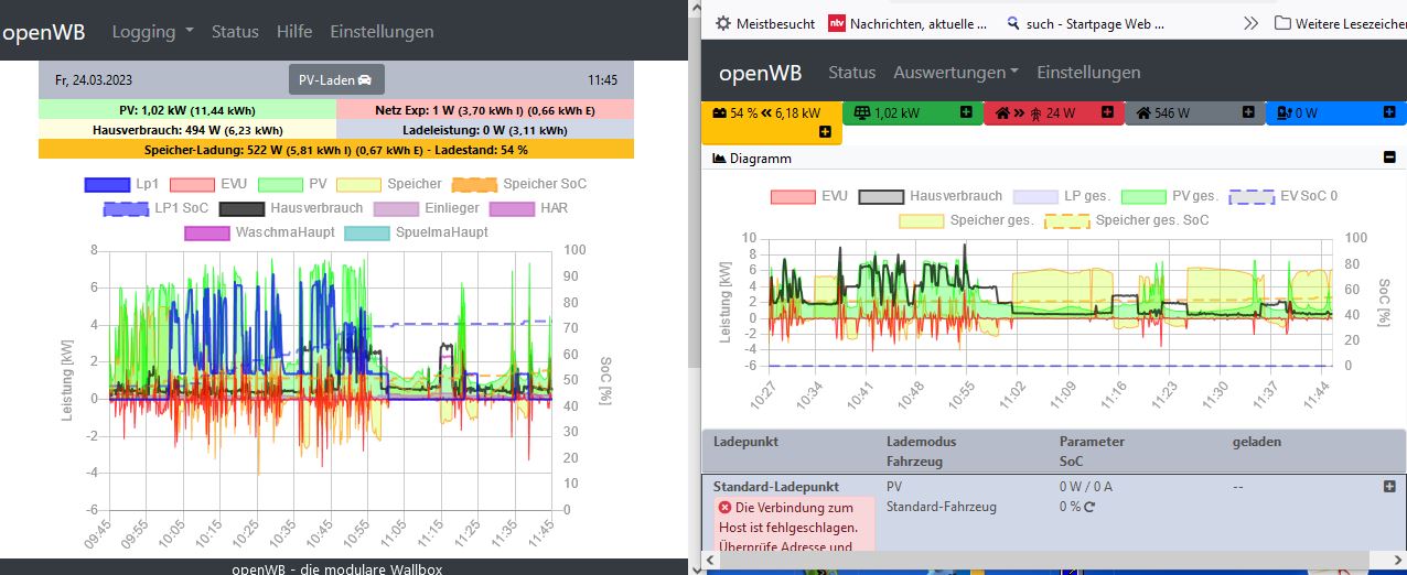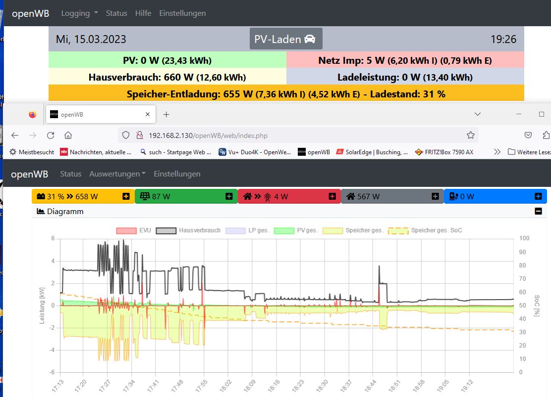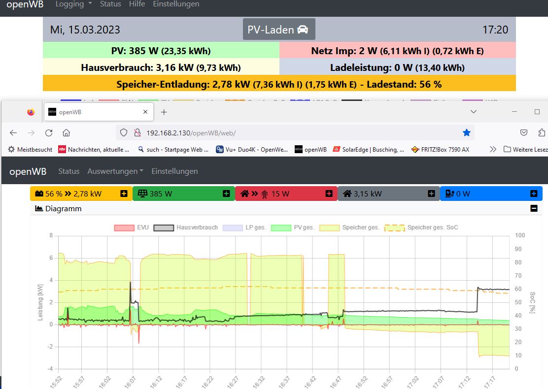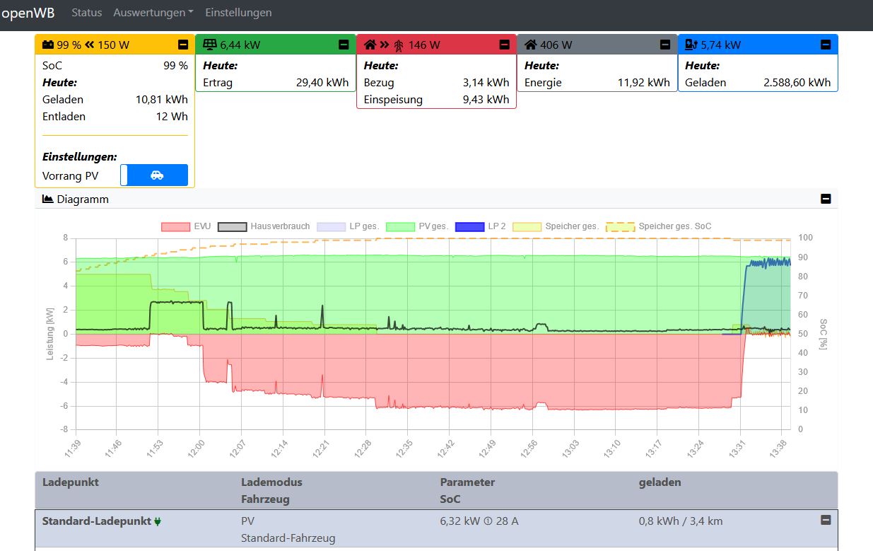 Es hat sich bestätigt, dass bei nahezu konstanter Leistung von PV und Hausverbrauch der Ladestrom laufend pendelt ( im Beispiel zwischen 5,7A und 6,4A ).