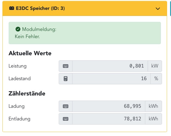Als das e3dc-Modul neu war, hat es funktioniert. Ist irgendwann mit einem der letzten Updates kaputt gegangen.