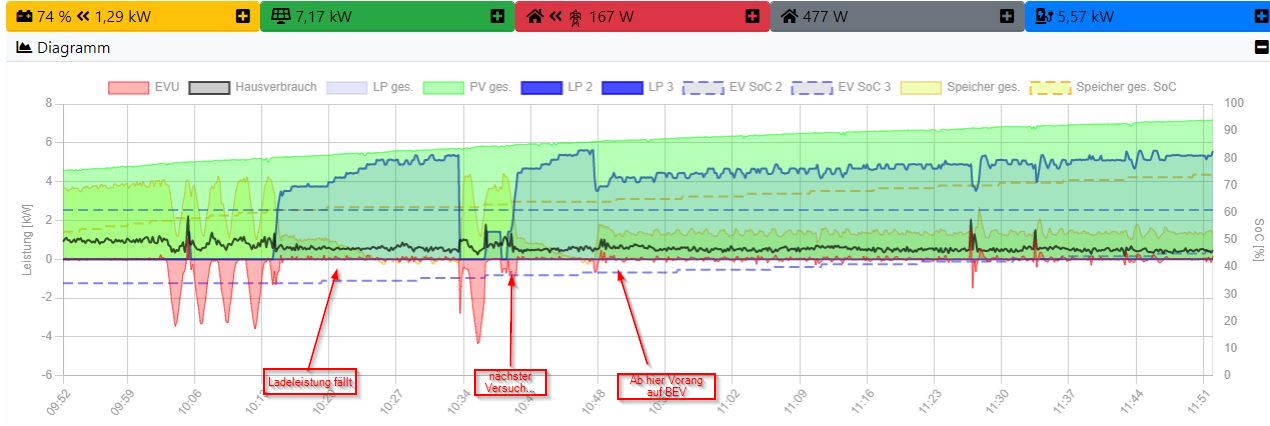 Was passierte? bei reichlich vorhandenem Überschuss ging jedoch die Ladeleistung des Speichers gegen 0 und alles ging ins Auto...