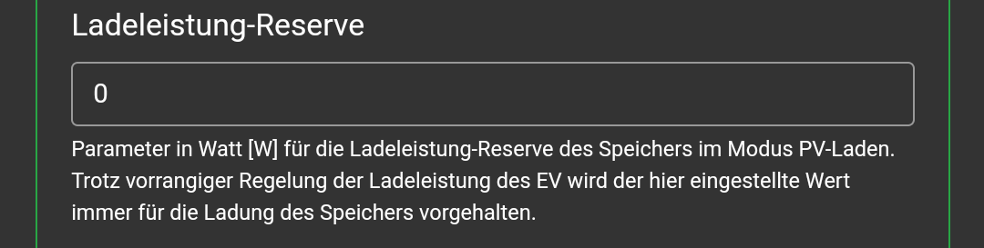 Was du als Ladereserve eingibst wird nur bei EV-Vorang geblockt, quasi als fein einstellbarer Wert, wenn denn gewünscht (lese ich zumindest so aus dem Hilfetext).