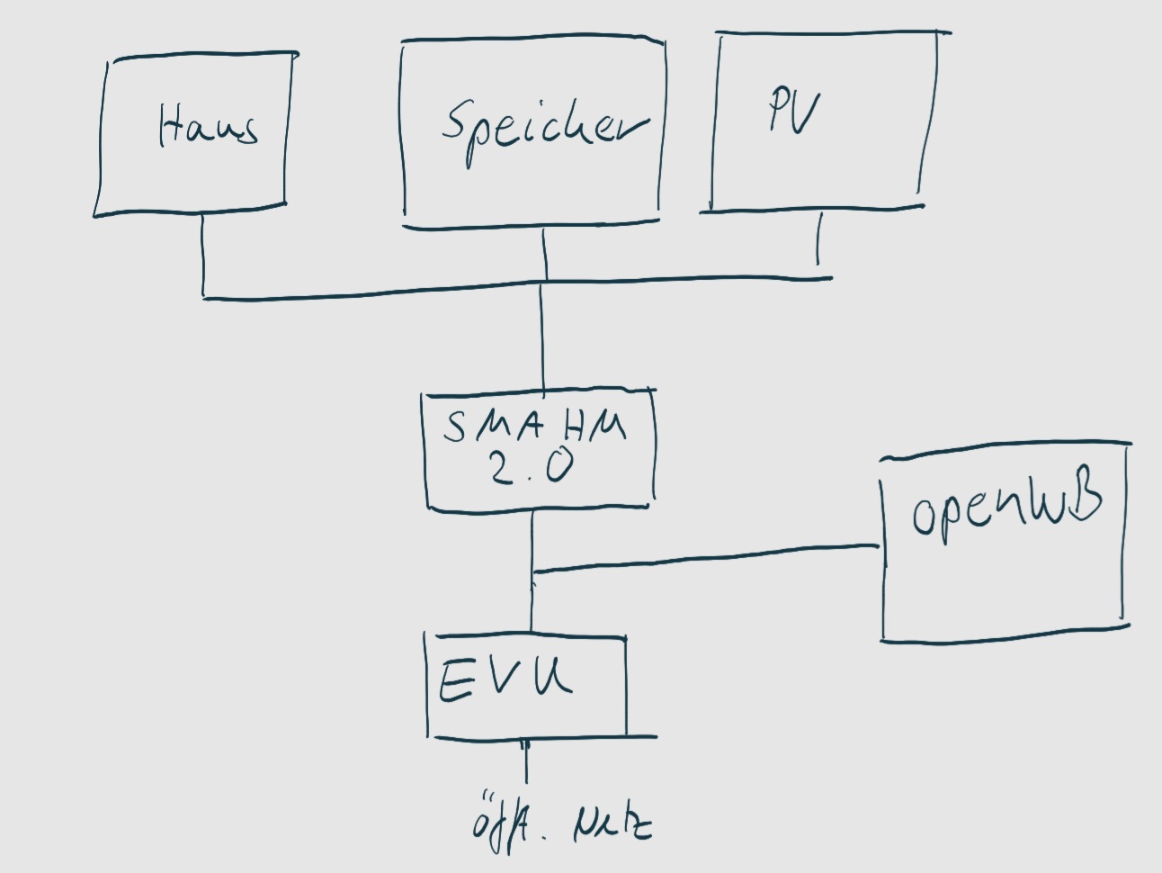 Habe es getestet: Bezug geht weder in der openWB noch im SMA Dashboard hoch. Aber der EVU-Zähler zählt (also immerhin nicht davor angeschlossen). Ich vermute, die Verkabelung sieht also so aus (sorry für die schlechte Skizze):