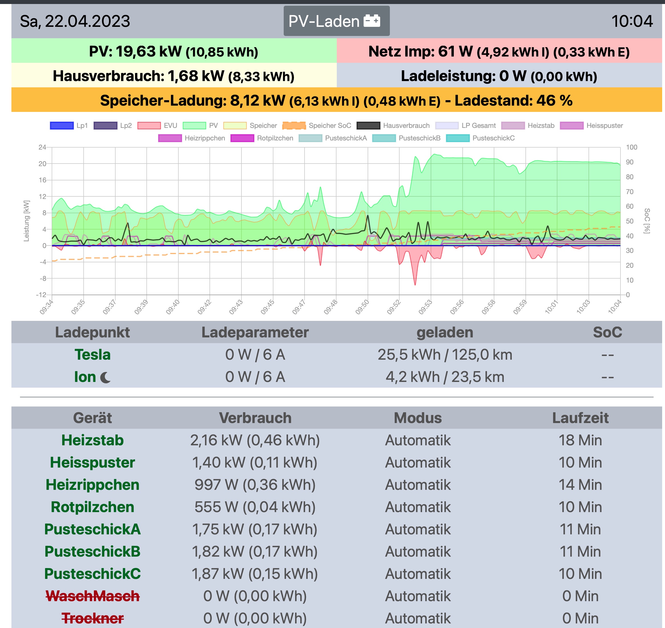 gerade heute früh war ich aufgrund der Wettervorhersage - trüb und bewölkt - schon fast auf dem Weg den Kamin anzuzünden, da kam die Sonne raus. Und dieses Bild wollte ich einfach mal teilen, wie schön die openWB die ganzen elektrischen Zwischenzeitheizungen anschaltet und auch für warmes Wasser sorgt. Da kommen knappe 20kW vom Dach und es ist nichts eingespeist worden. Herrlich, so muss das sein!