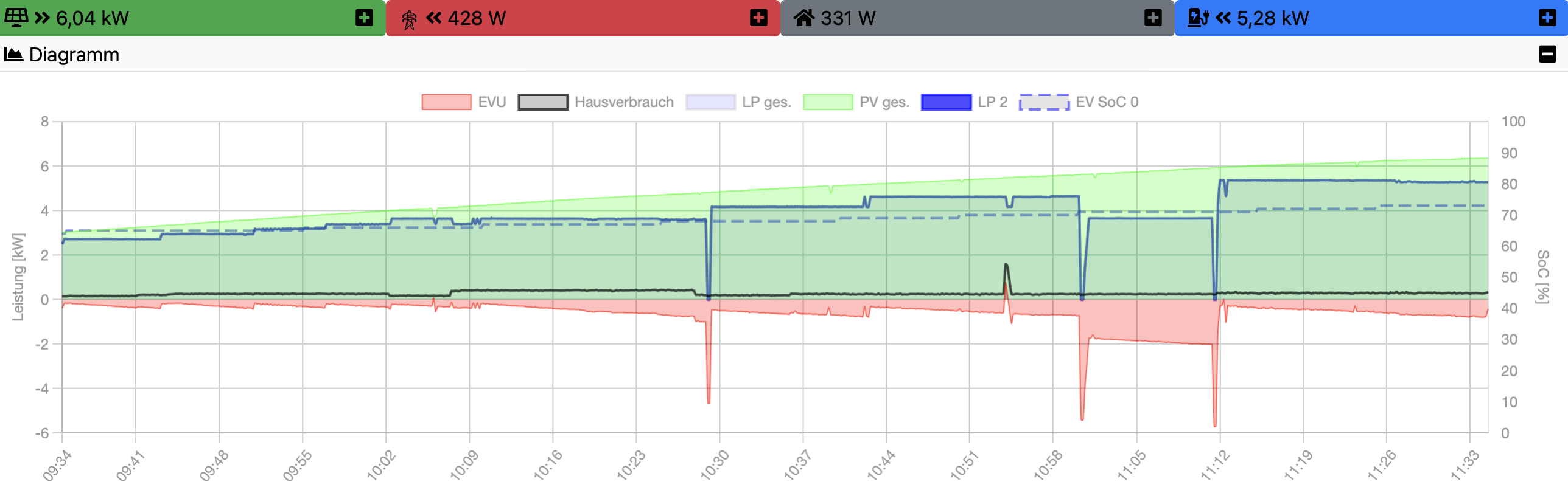 So wie es aussieht hab' ich noch ein 1p/3p Umschaltungsproblem. Die Umschaltung während PV-Laden von 1p auf 3p hat wie erwartet funktioniert, allerdings blieb der Ladevorgang nicht bei 3p sondern hat wieder auf 1p gewechselt. Auf den ersten Blick kann ich keinen Grund hierfür erkennen, es gab zwar kurze Einbrüche, aber die meiste Zeit blieb dennoch etwas Einspeisung übrig. Ich hätte daher keinen Wechsel zurück auf 1p erwartet.