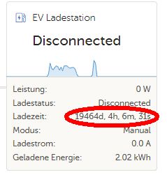 Beim registrieren wird nach wie vor die Ladezeit von 19473d angezeigt, diese wird dann mit dem ersten Laden aber auf 0 gesetzt. Die Zeit läuft pro Ladevorgang und wird es beim unplug wieder auf 0 gesetzt. Sprich wird das Auto per PV über einen längeren Zeitraum geladen und bleibt dabei die ganze Zeit mit der oWB verbunden, wird die gesamte Ladezeit angezeigt. Der Zähler läuft weiter, sobald die Summe der Ladeströme größer 0 ist.