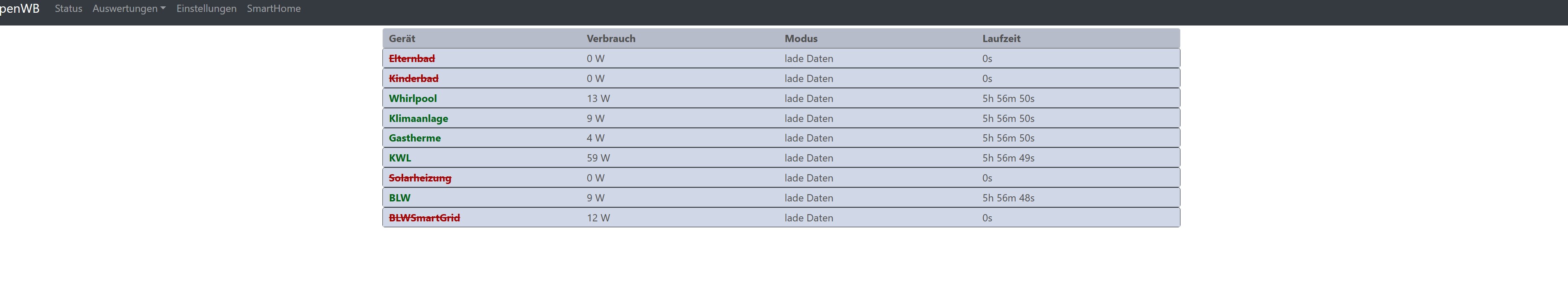 In der Übersicht bei Modus bleibt: "Lade Daten" bei allen Geräten, Verbrauch und Laufzeit passt.