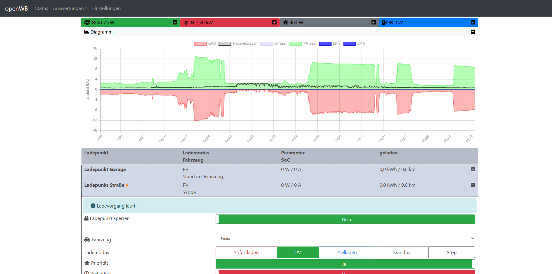 Wenn jetzt - aus welchem Grund auch immer - im Webinterface der Ladepunkt von PV-Laden auf Standby oder Stop umgestellt wurde, dann wird zwar das Anstecken eines Fahrzeuges erkannt und durch den RFID-Tag auch das richtige Fahrzeug ausgewählt, allerdings wird nicht das PV-Laden aktiviert. Gleiches Problem wenn der Ladepunkt per WEB-Interface gesperrt wird.