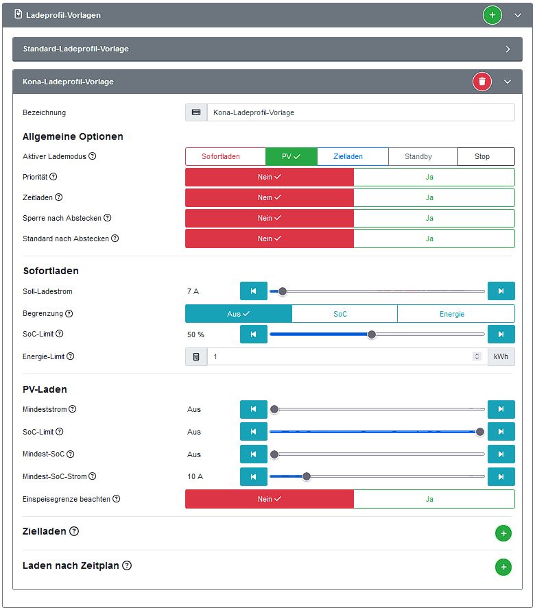 ChargeTemplateData(name='Kona-Ladeprofil-Vorlage', disable_after_unplug=False, prio=False, load_default=False, time_charging=TimeCharging(active=False, plans={}), chargemode=Chargemode(selected='pv_charging', pv_charging=PvCharging(min_soc_current=10, min_current=0, feed_in_limit=False, min_soc=0, max_soc=101), scheduled_charging=ScheduledCharging(plans={}), instant_charging=InstantCharging(current=7, limit=Limit(selected='none', amount=1000, soc=50))))