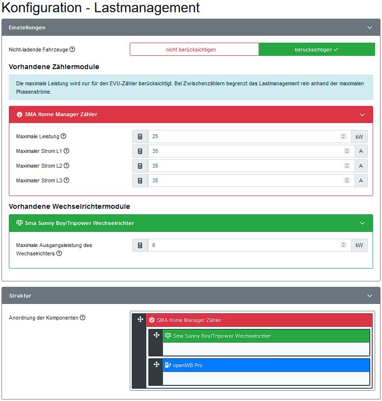 2. versucht diese als einfachen Ladepunkt zu konfigurieren, dazu einen virtuellen Zähler und einen internen Ladepunkt angelegt. Anschließend das Lastmanagement konfiguriert.