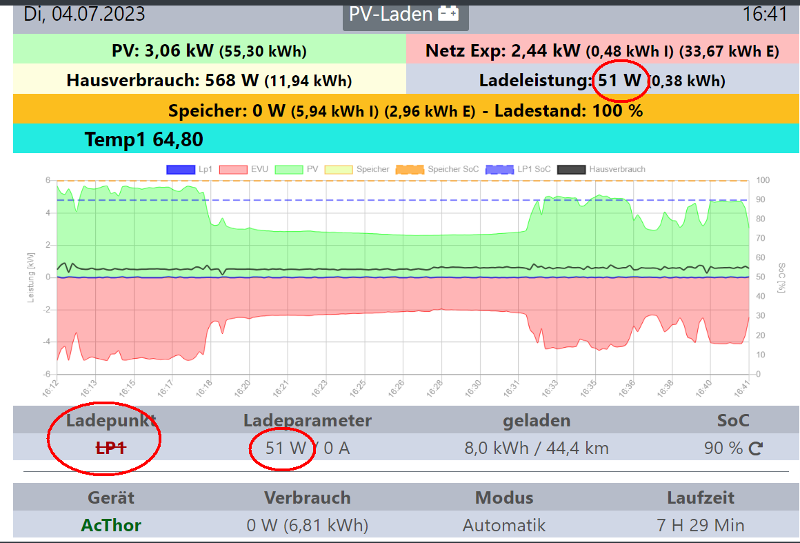 2023-07-04 16:25:01: PID: 3246: **** Regulation loop start **** (LV1) at 77 main /var/www/html/openWB/regel.shIm Display wird auch die Wattzahl angezeigt