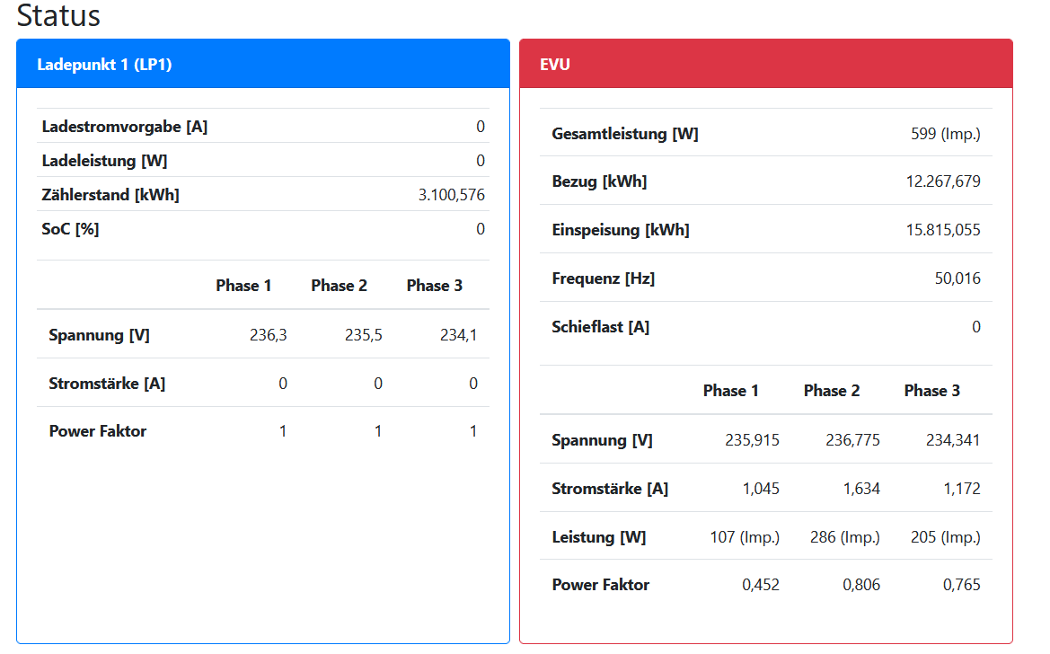 darf ich diesen alten thread noch einmal rauskramen? Ich bin leider jetzt erst dazu gekommen, das von aiole vorgeschlagene Experiment durchzuführen. PV- und Batterie-Leistung waren auf 0 und es war nur der normale Grundverbrauch aktiv. Zunächst habe ich die openWB auf 1ph Laden bei Sofortladen eingestellt. Bevor ich die Ladung gestartet habe, sah der Status so aus: