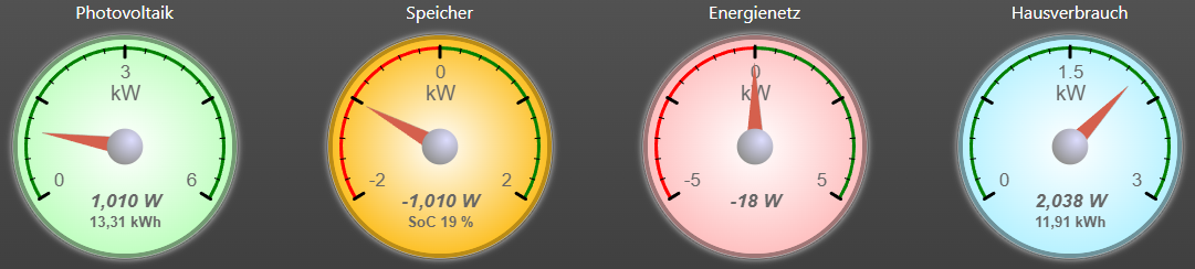Angezeigt werden PV 1KW, Speicher -1KW und Hausverbrauch 2KW