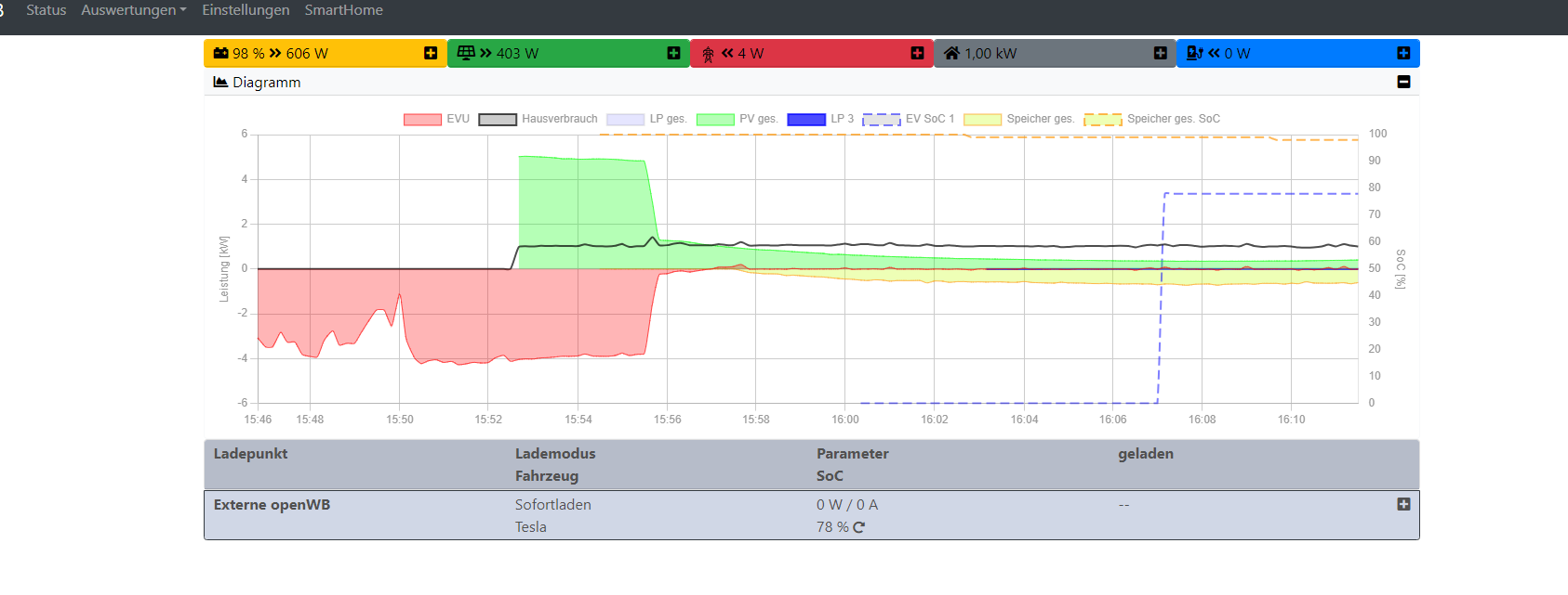 15,2kWp SMA (SB4000TL-21, SB3.0, STP6.0-SE + BYD HVS, EnergyMeter), openWB Standard+, openWB Pro, Smart #1 (ersetzt den e2008), Tesla Model Y LR.