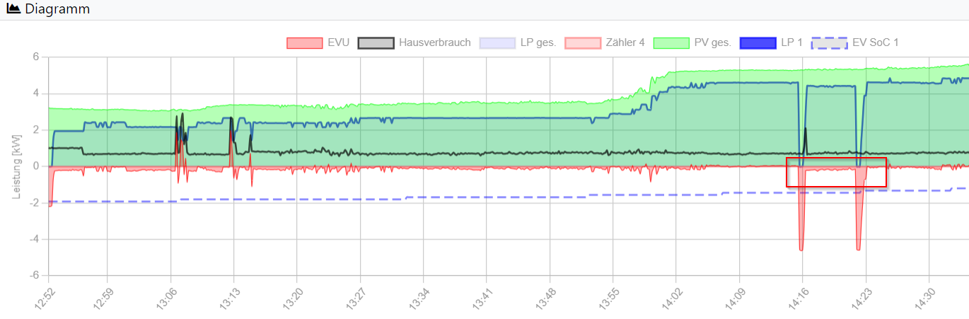 Im Beispiel anbei war genug Überschuss vorhanden, um auf 3 Phasen zu bleiben (allerdings nur mit 6A), es wurde aber nach der Haltezeit (bei mir 4 Minuten) wieder auf 1 Phase zurückgeschaltet: