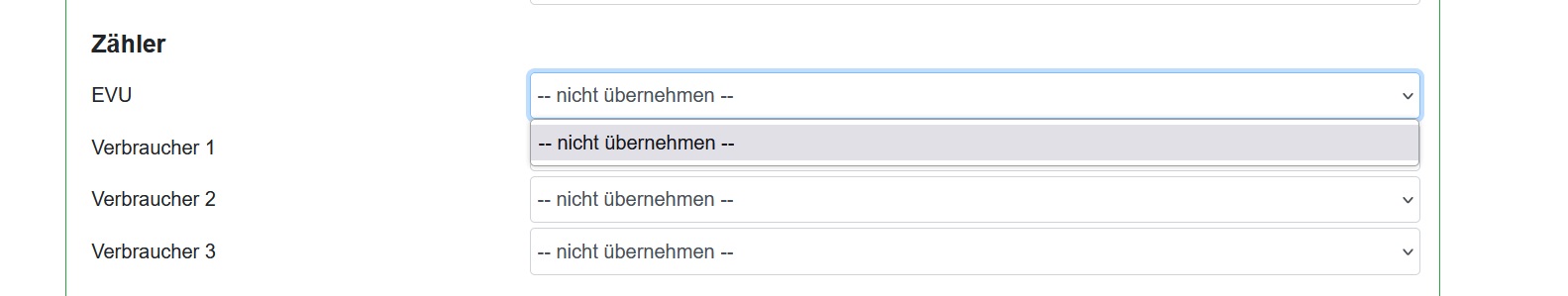 Beim Import kann ich Wechselrichter und Ladepunkt in den entsprechenden Feldern auswählen . Aber beim EVU kann ich nicht den entsprechenden smart Meter auswählen und als Resultat wird mir aus 1.9 kein Hausverbrauch übernommen..