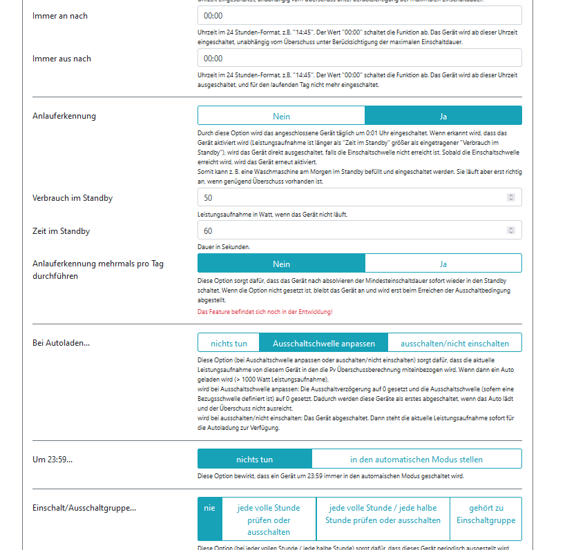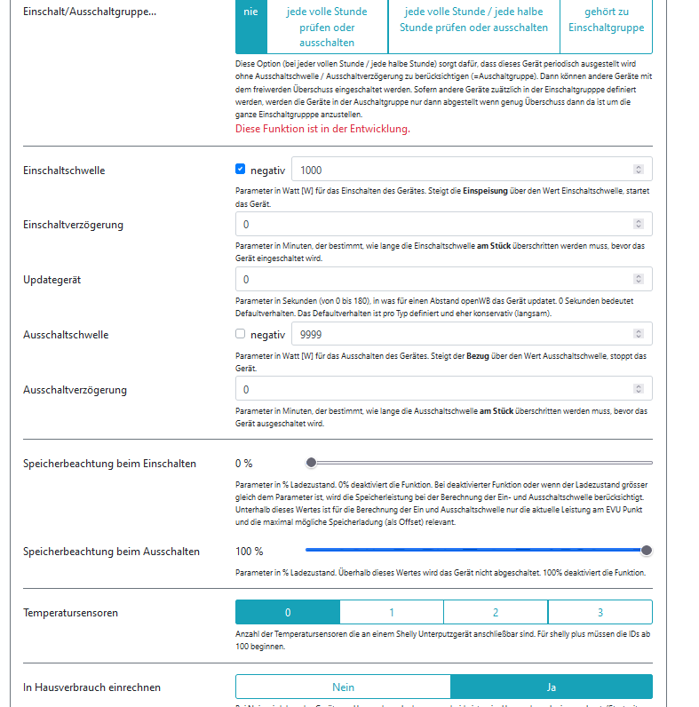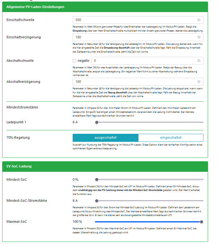 PV Laden ist so eingestellt, dass erst bei (edit) Einspeisung das Laden beginnen soll, der Hauspeicher soll nicht für das EV Laden benutzt werden