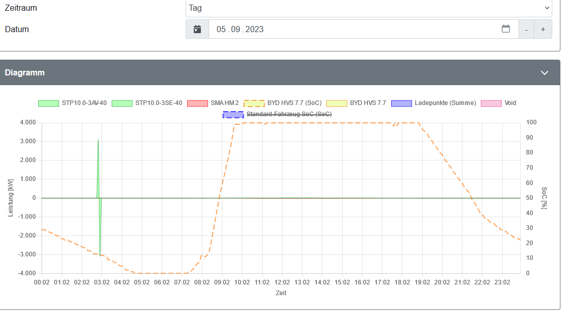 Allerdings ist er tatsächlich die ganze Zeit ungefähr konstant bei ca. 600 W. Wo kommen die Peaks und damit auch die Lücken bei der Einspeisung im Chart her? Was wird hier falsch ausgerechnet?