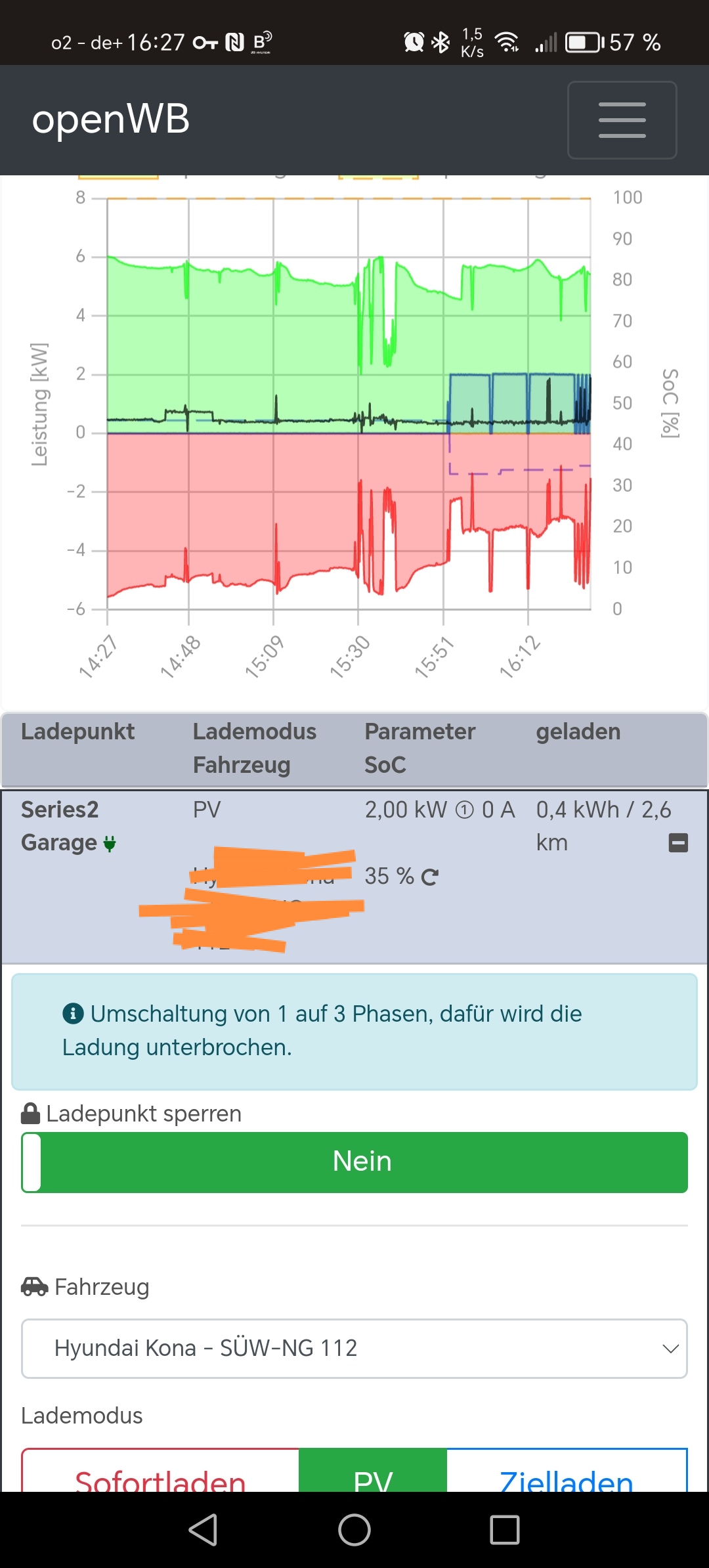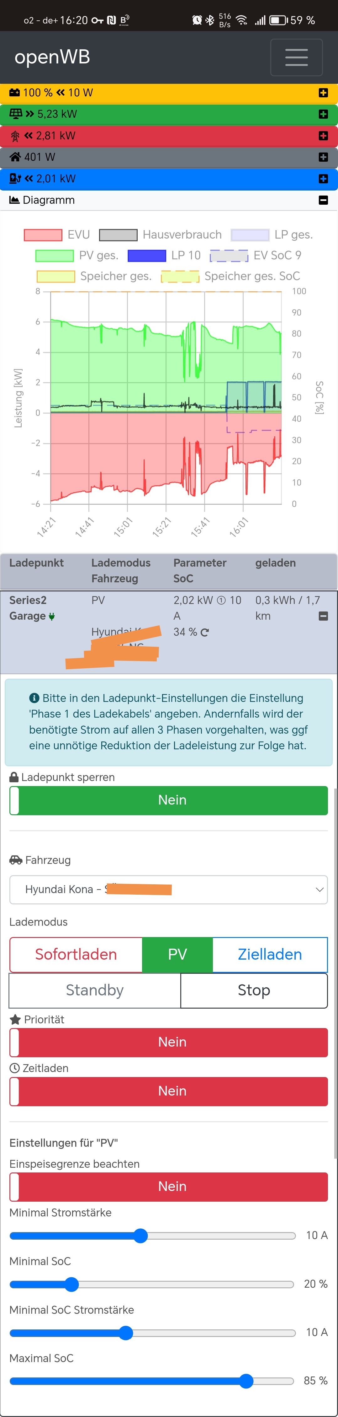 die erste Ladung über die eigene Wallbox, Powerwall voll, wir haben eigentlich noch 5kw PV Produktion