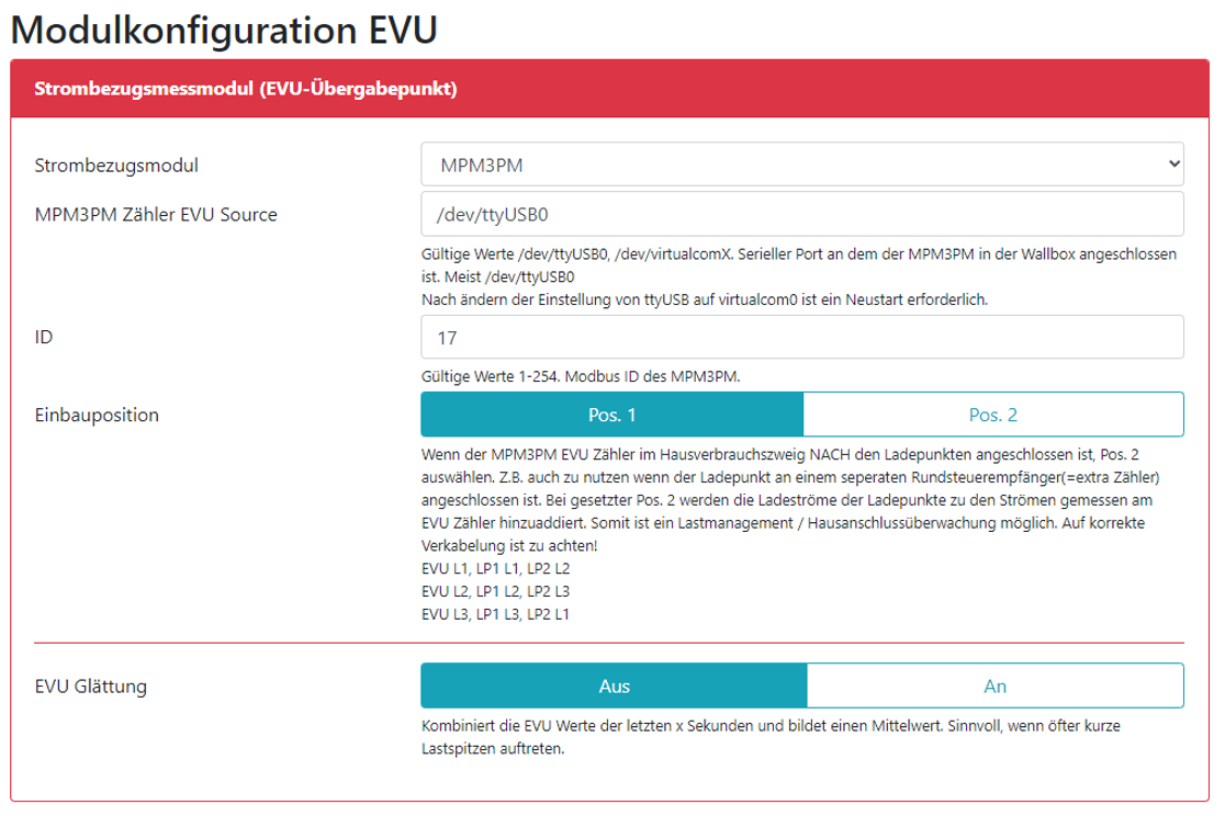Ich habe in der WB bisher vier MPM3PM Modbus Zähler konfiguriert (1x EVU, 1x PV, 2x Ladepunkte). Diese hängen zusammen mit den beiden EVSE DIN am Modbus. USB1 mit EVU-Zähler, PV-Zähler, LP1-Zähler und EVSE DIN LP1 und USB2 mit LP2-Zähler und EVSE DIN LP2.