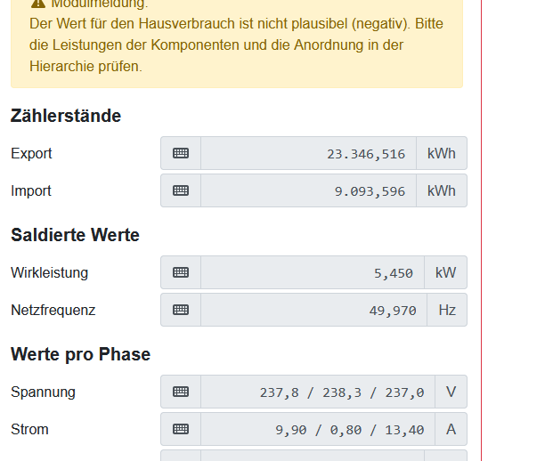 Hier die Werte von openWB( Bild 2) und Zähler (Bild 1) mit Fehlermeldung Hausverbrauch ist nicht plausibel.