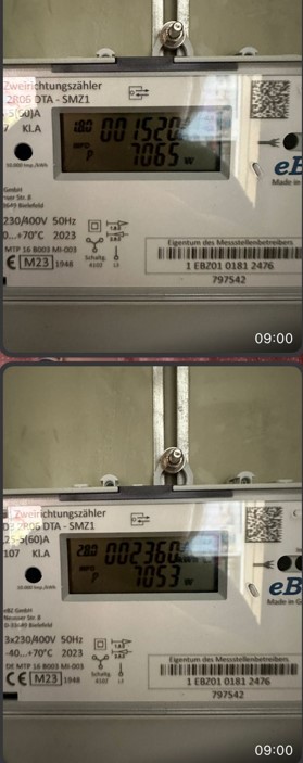 Zusätzlich zeit der Zähler auch die aktuelle Leistung an, in deinem Fall 7000W. Ob diese bezogen oder eingespeist werden erkennt man am Vorzeichen welches wenig intuitiv _rechts_ vom Leistungswert zu finden ist. Dort gibts ein '-' wenn eingespeist wird. Bei deinen Bildern werden also aktuell 7kW bezogen.