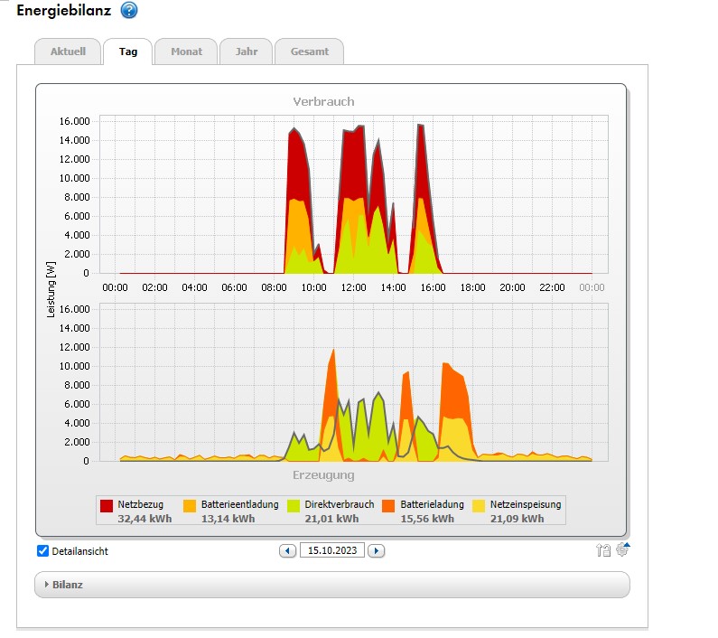 viel zu Hoch angezeigt (Teilweise 14.000 W momentan verbrauch) Laut meinem Zähler ziehe ich 7000w vom Netz und speise 7000w zeitgleich ein. Dazu kommt , dass ich laut Grafik den kompletten Strom welche ich über die Module generiere und mein kompletter Speicher ins Haus läuft. Somit komme ich auf einen Momentan verbrauch von 14kwh.