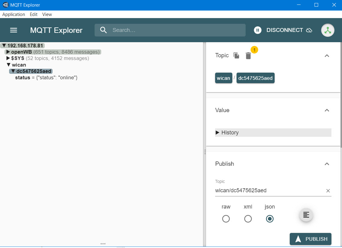 Man kann mit dem MQTT-Explorer auch manuell den SOC abfragen, indem die Anfrage aus configuration.py ohne die backslashes "\" vor den Anführungszeichen im rechten Teil des MQTT-Explorer-Fensters an das richtige Topic schickt. Dazu auf das tx-Topic klicken, rechts open das Kopier-Symbol klicken, Strg+V rechts in die MItte auf das Topic und im großen Textfeld die Botschaft einfügen, Formatbutton sollte wohl auf raw stehen.