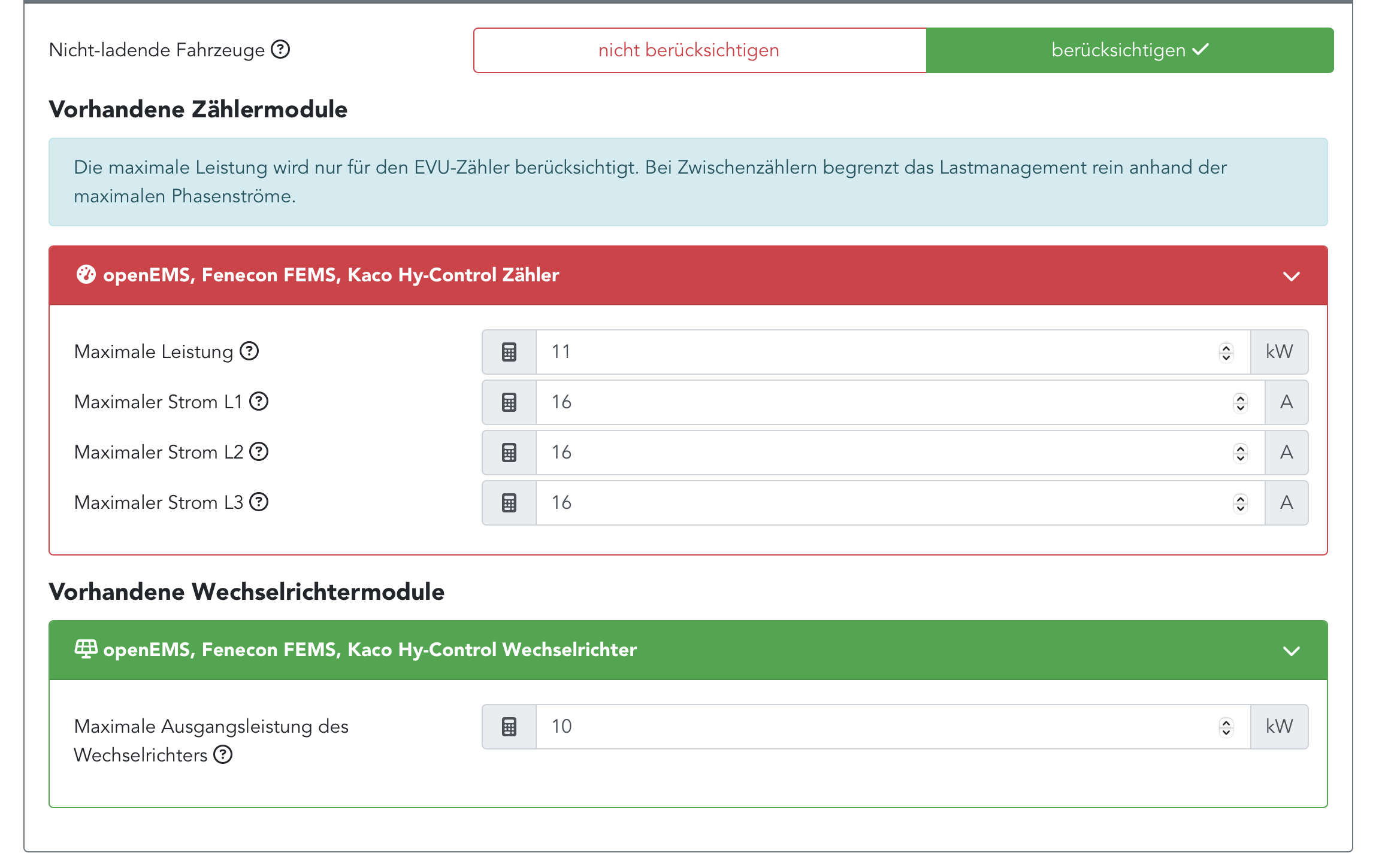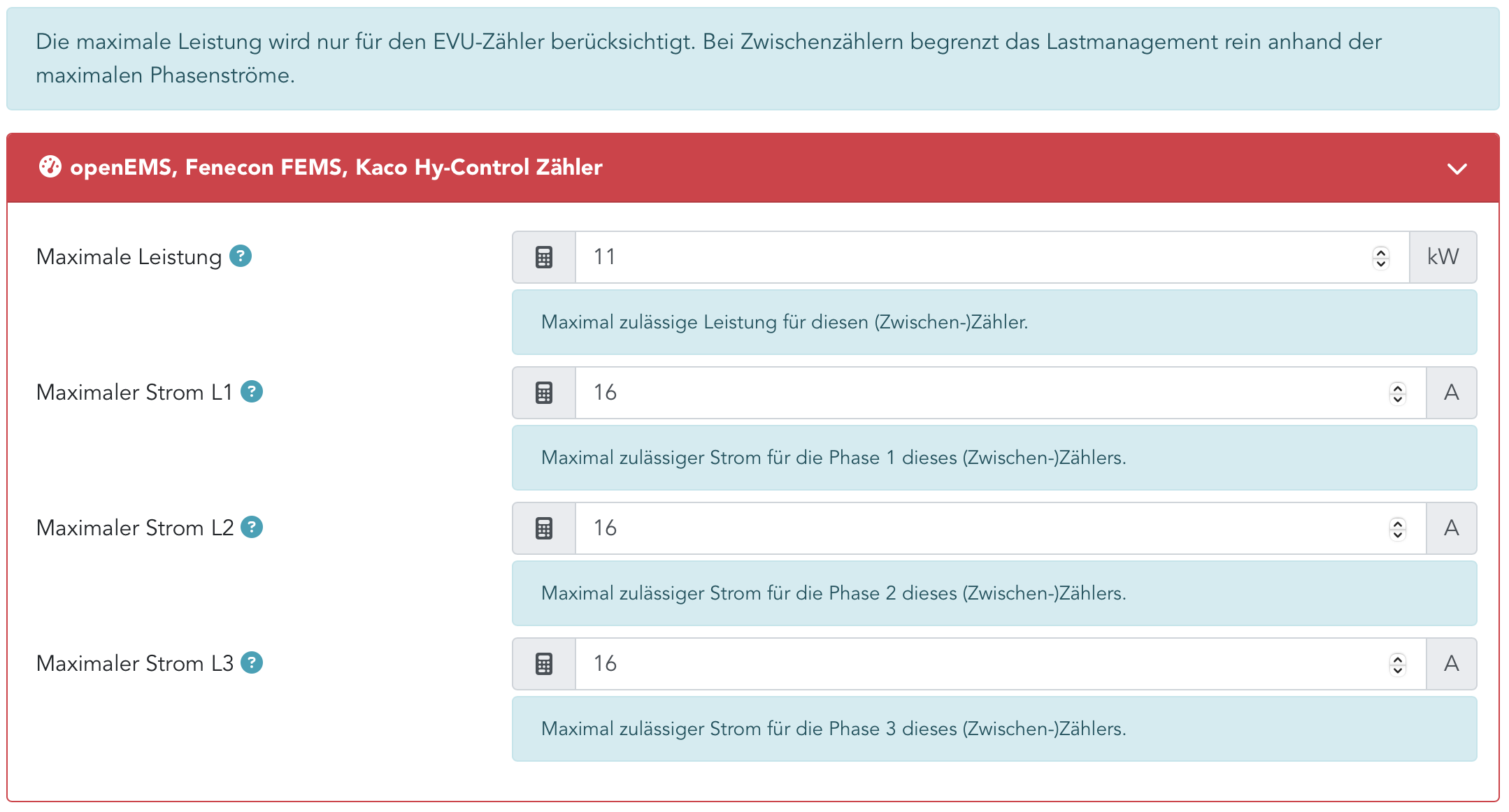 Dann habe ich wohl die blauen Hinweise nicht verstanden und zu niedrige Werte eingetragen. Nur die Notstromseite des WR ist auf 10 kW begrenzt, aber die hat eine eigene UV, an der die OpenWB nicht hängt.
