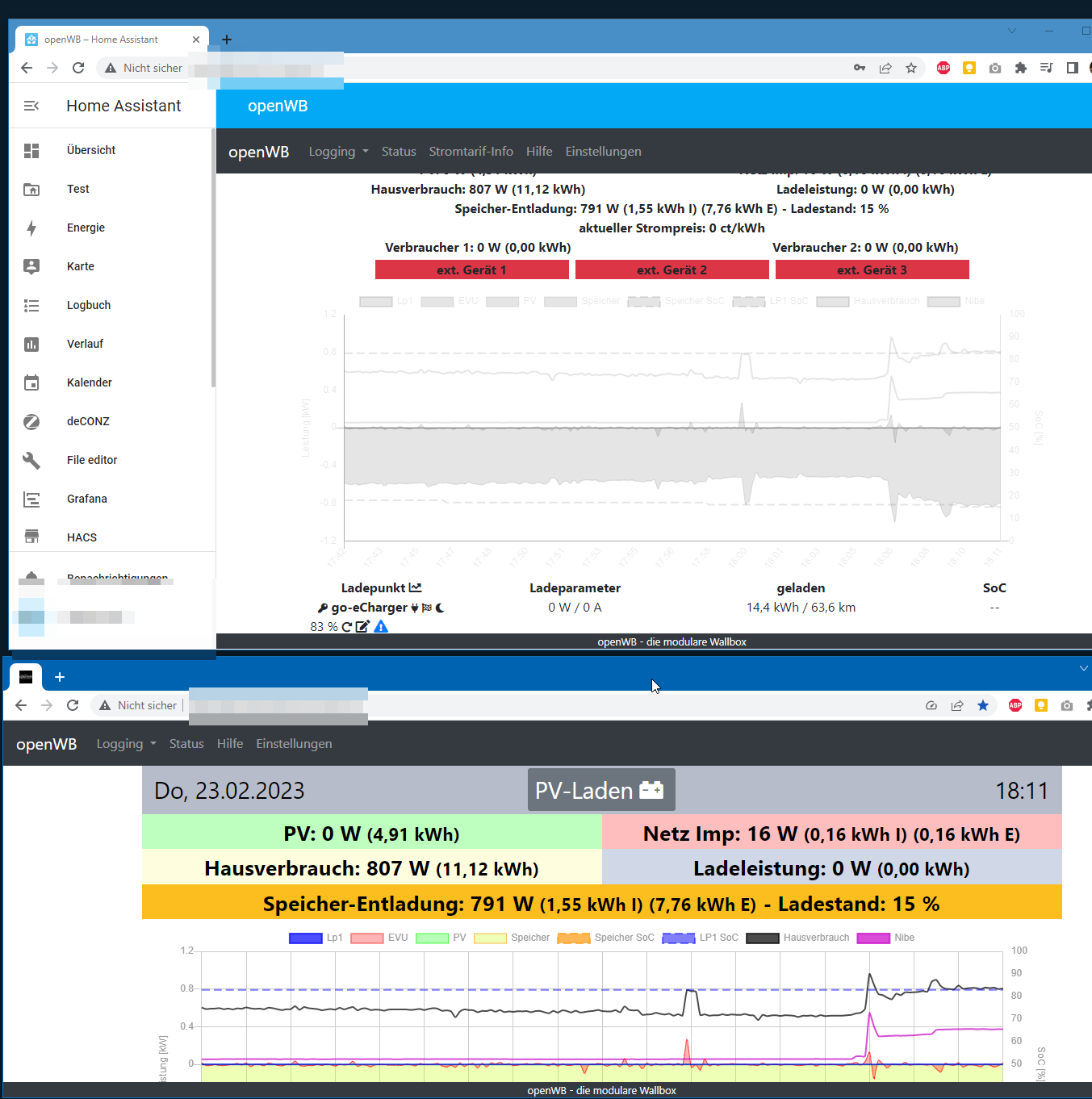 ich würde das openWB Webinterface gern innerhalb von Home Assistant als Panel/IFrame einbinden. Das klappt auch, nur sieht das Webinterface komplett anders aus als wenn ich es per Browser öffne. Mir erschließt sich nicht, woran das liegt. Gibt es eine Möglichkeit, die gleiche Darstellung zu bekommen? Siehe Bild.