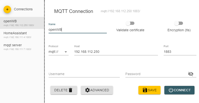 Auch hier musst du die IP Adresse UND den Benutzernamen ändern. Mein Benutzer in HA war mqtt. Wie lautet deiner? Nicht das hier schon ein Problem existiert. Verbinde dich dann mit HA und schaue, ob es klappt. Kannst du dich Verbinden und wenn ja, was siehst du? Siehst du nur $SYS, oder auch openWB?